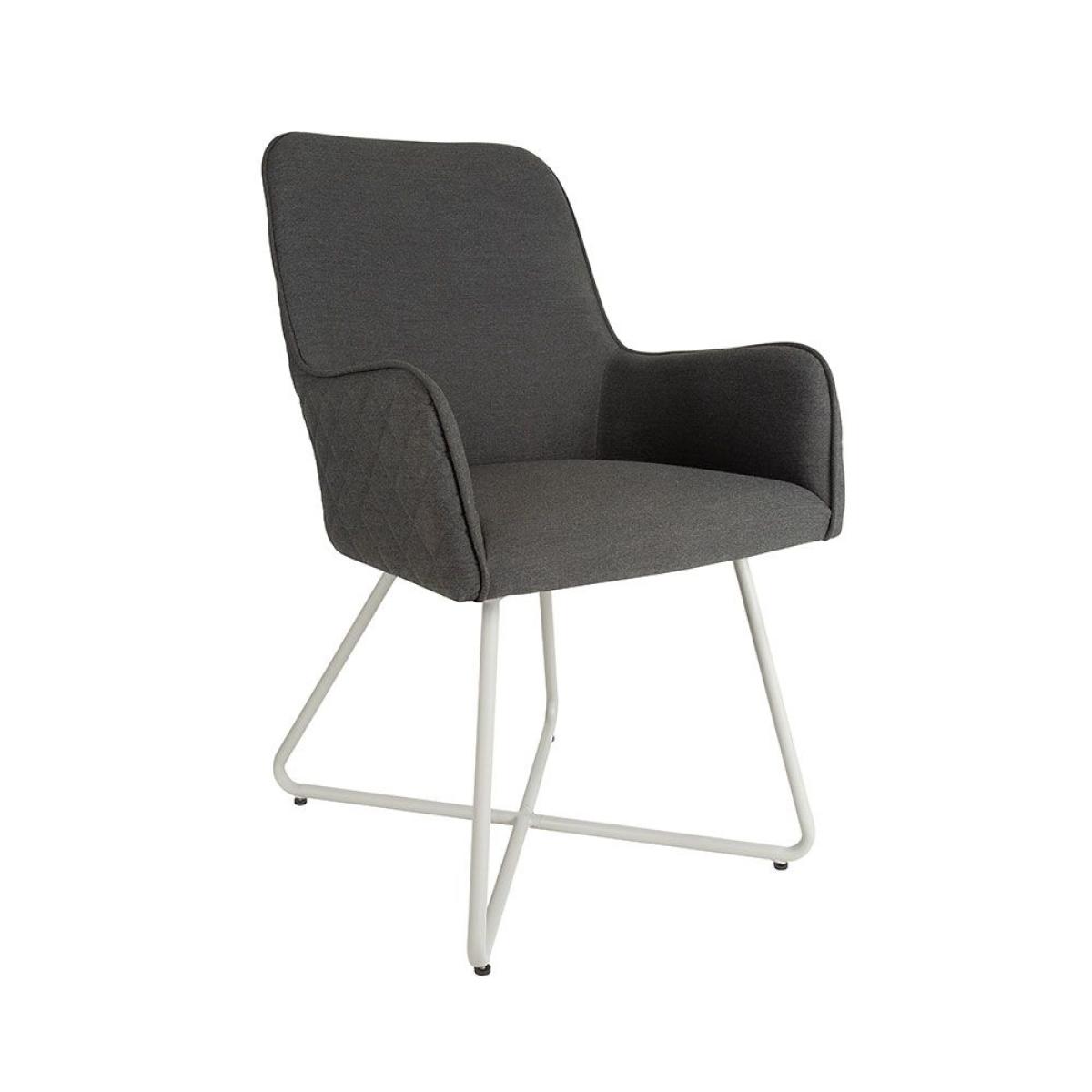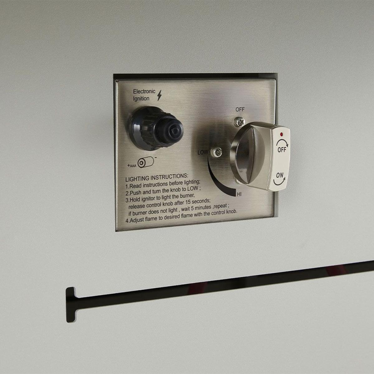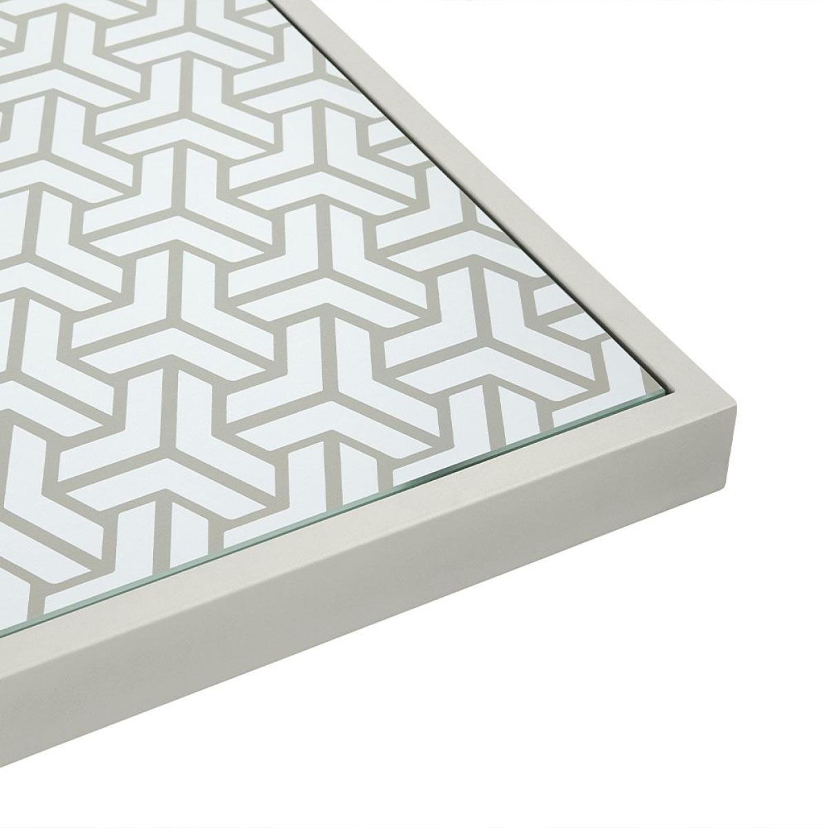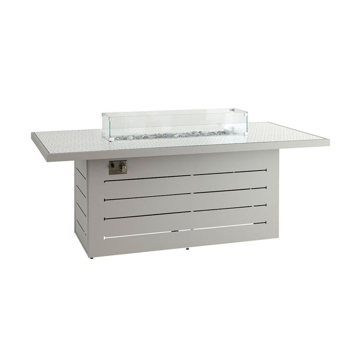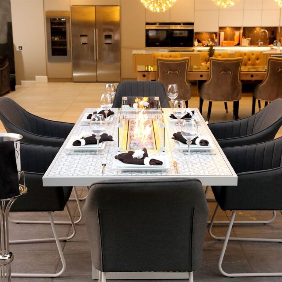 This Santorini Dining Table Set is a spectacular garden centre piece in a style that is sure to wow your guests. Featuring a gas powered built-in fire pit surrounded by tempered glass, the table is finished with a grey and white geometric pattern and is supported by a plinth base that houses your gas bottle. Included in this set are six dining chairs in a modern design and made from UV resistant fabric. The foam in these chairs is made from a honeycomb formation that allows rainwater to go straight through the chair ensuring they dry quickly. The chair legs are built from rust-free aluminium. Take your outdoor dining to the next level with this amazing dining set.