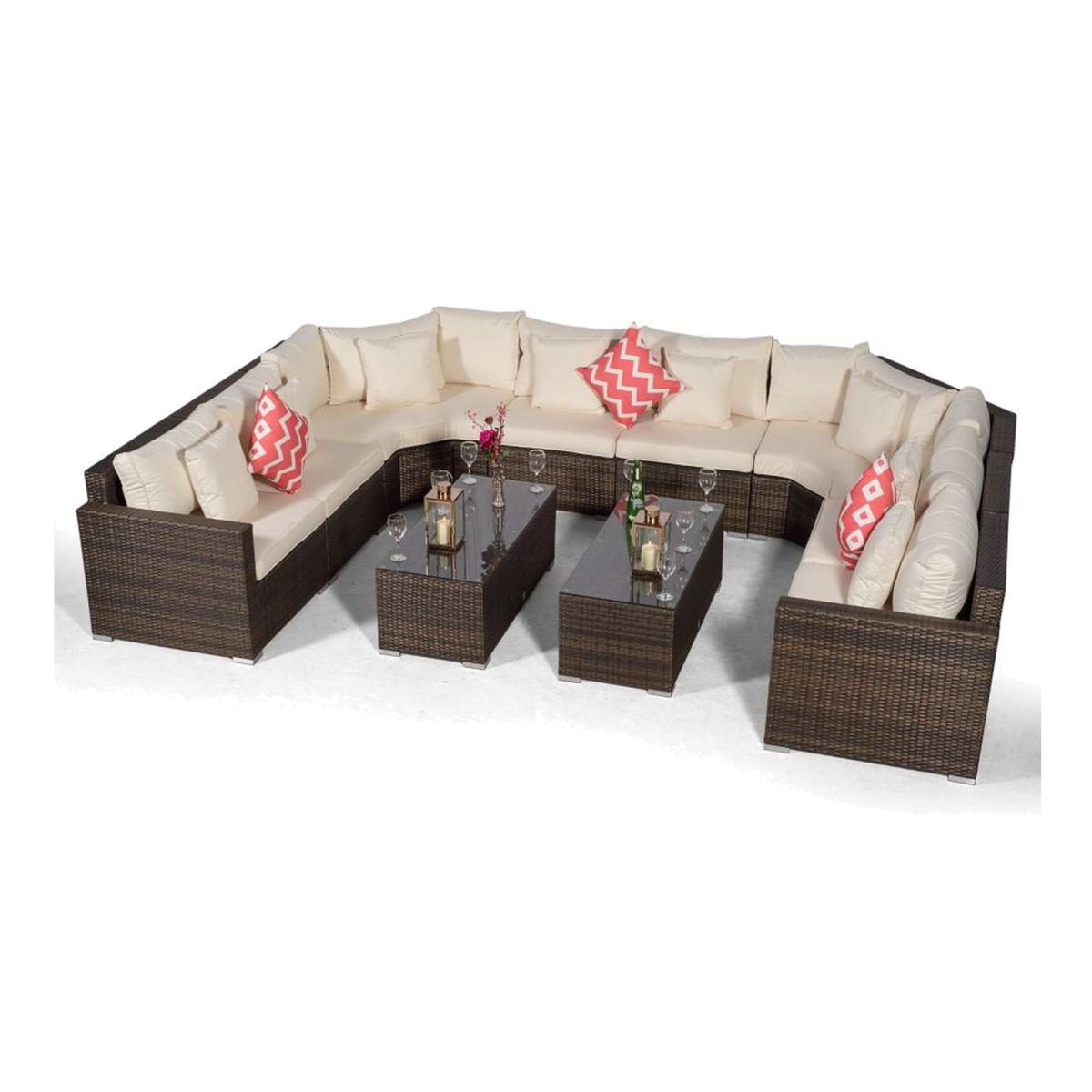 Consisting of 8 modular seats, 2 coffee tables protective covers, this version of the Santorini rattan sofa set can seat 8-10 people. Due to its modular design the Santorini rattan sofa set can be configured in a variety of combinations from U to L shaped to suit your needs. Giardino poly rattan garden furniture is available in a stunning mixed brown or ultra stylish mixed grey weave making the Santorini outdoor sofa set the focal point of your garden. The end seats of this rattan patio set feature adjustable bases which effortlessly convert the sofa into comfortable reclining sun loungers. The versatile Santorini U shaped rattan sofa set has got everything you need to enjoy long warm summer days whilst making your patio, paved or decked garden area look ultra stylish! Giardino rattan garden furniture features multi-density foam and fiber padded cushions making this outdoor rattan sofa set super comfortable. Featuring 10cm thick seat cushions and 20cm thick back cushions, the multi density fillings enhance the shape and structure providing comfort and support to your garden corner sofa. Our special water-resistant fabrics protect your rattan garden sofa set cushions from showers and all cushions feature removable covers for easy maintenance. Giardino rattan garden furniture is made using aluminium frames and polyethylene all weather rattan, making this outdoor rattan sofa strong, light-weight and corrosion resistant. Each modular section comes fully assembled and the impressive synthetic wicker furniture material is UV resistant, able to withstand temperatures from -15 degrees celsius to 60 degrees celsius. A damp cloth or garden hose on a gentle setting is all that's needed to maintain this rattan furniture set.