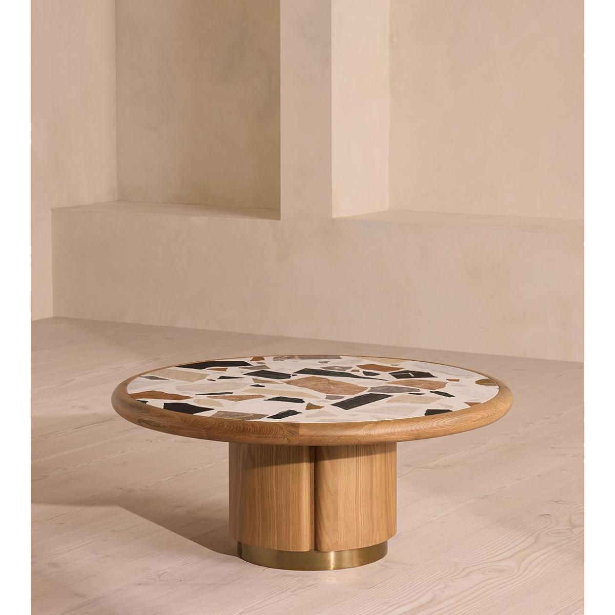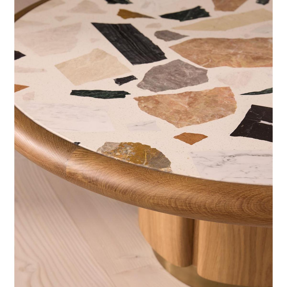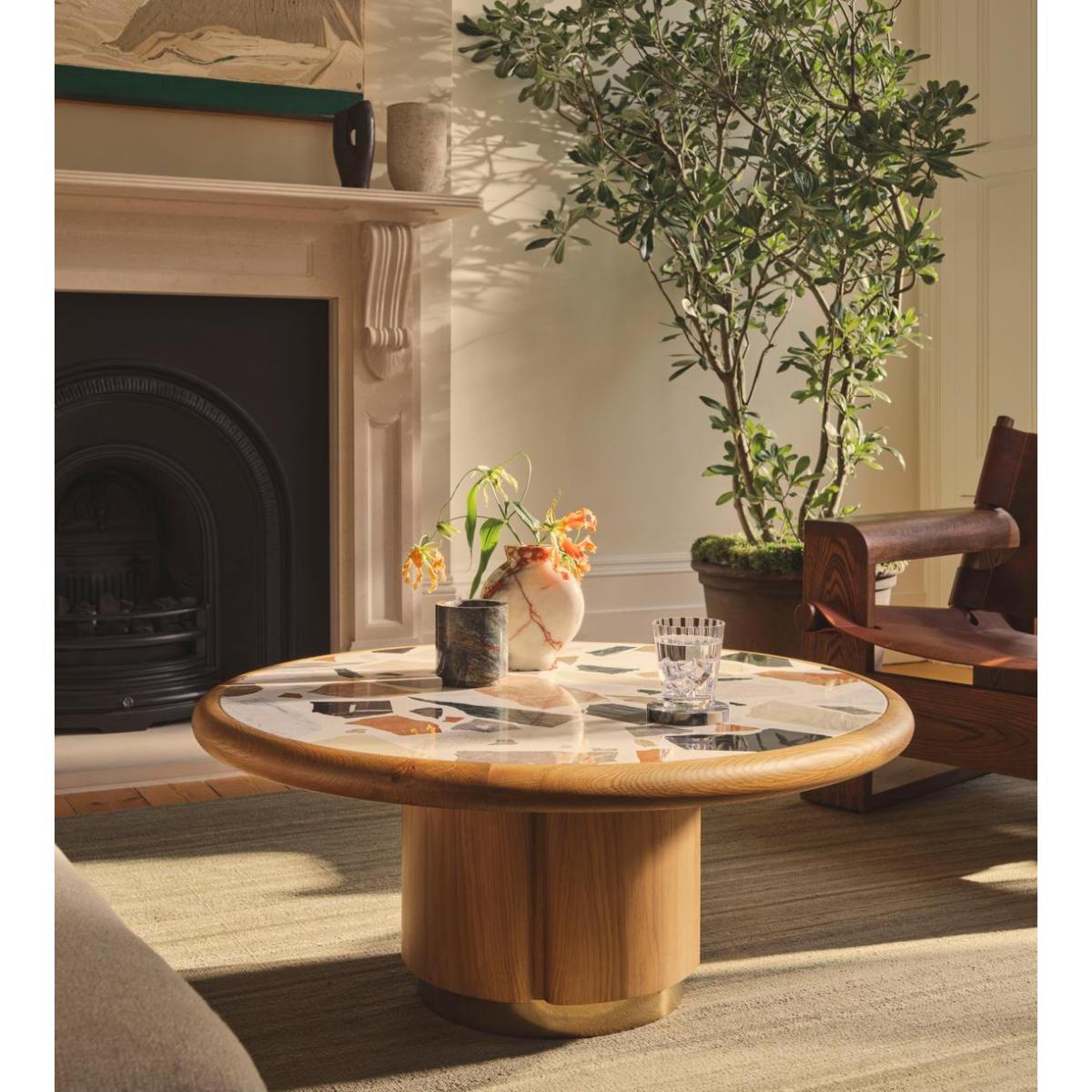 A striking terrazzo inset top is composed of 12 different types of polished marble. Set on an antiqued brass plinth, the Santos coffee table has a circular top on a pedestal base carved from oak. Solid oak lipping surrounds the polished terrazzo tabletop to create a statement centrepiece inspired by Brighton Beach House.