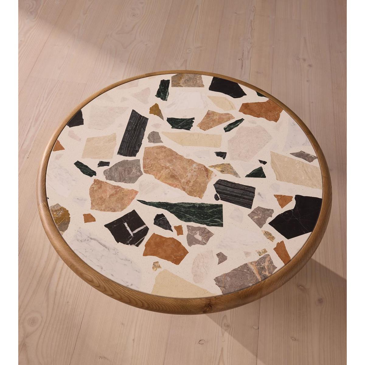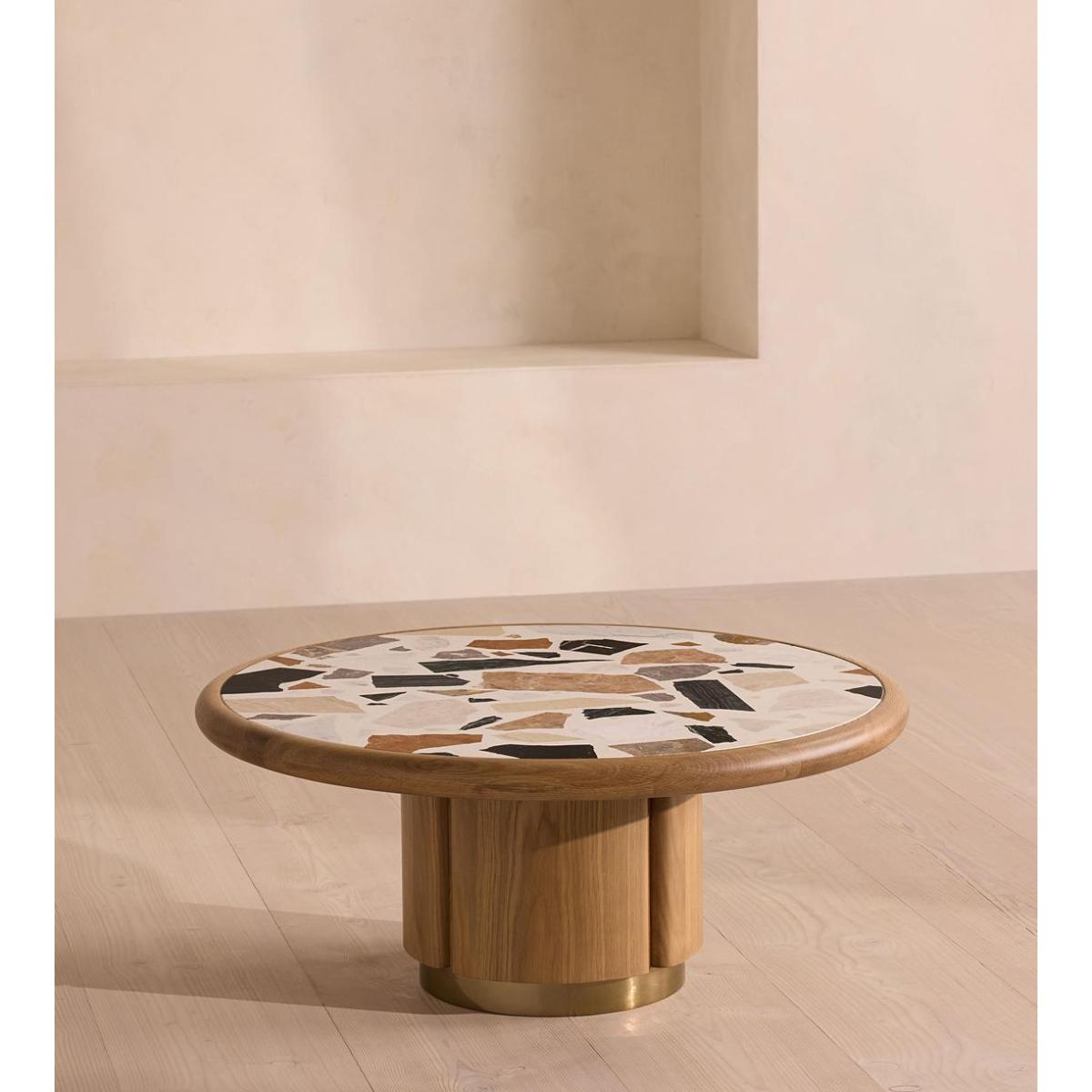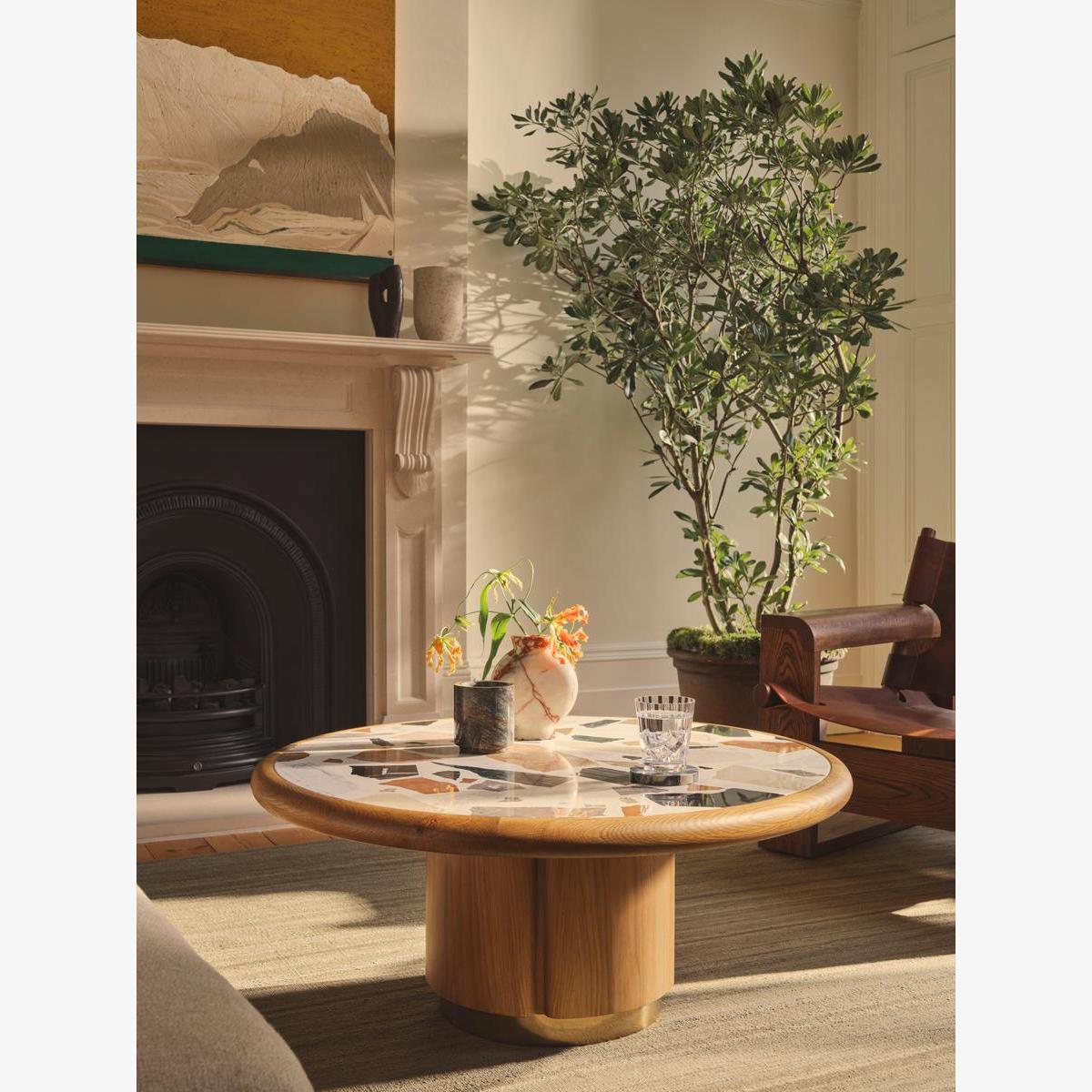 A striking terrazzo inset top is composed of 12 different types of polished marble. Set on an antiqued brass plinth, the Santos coffee table has a circular top on a pedestal base carved from oak. Solid oak lipping surrounds the polished terrazzo tabletop to create a statement centrepiece inspired by Brighton Beach House.