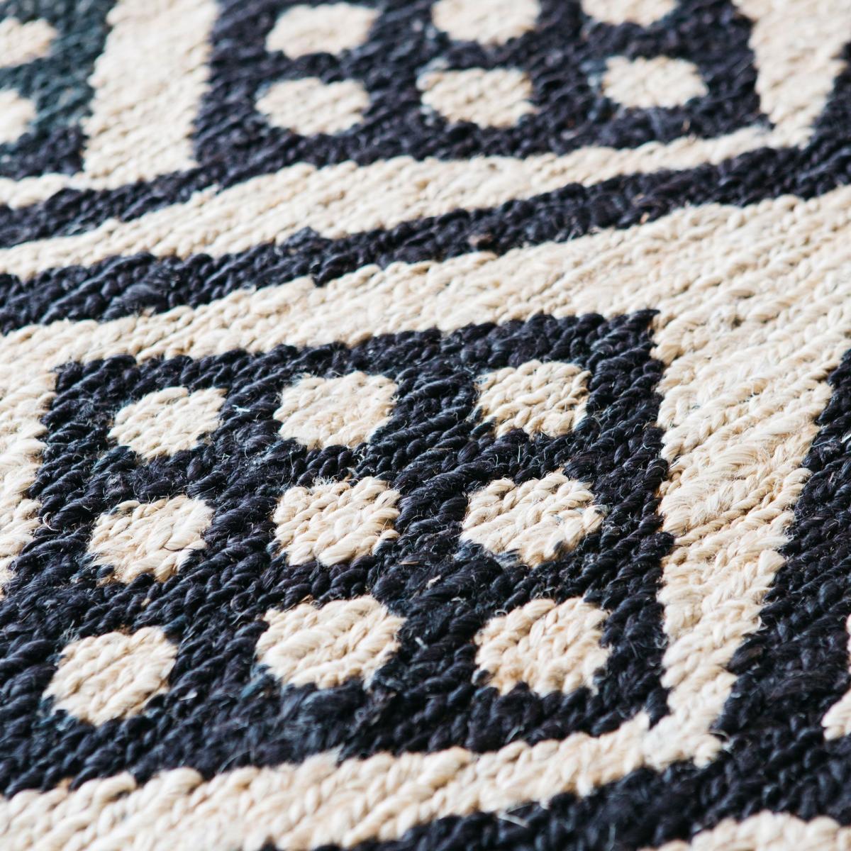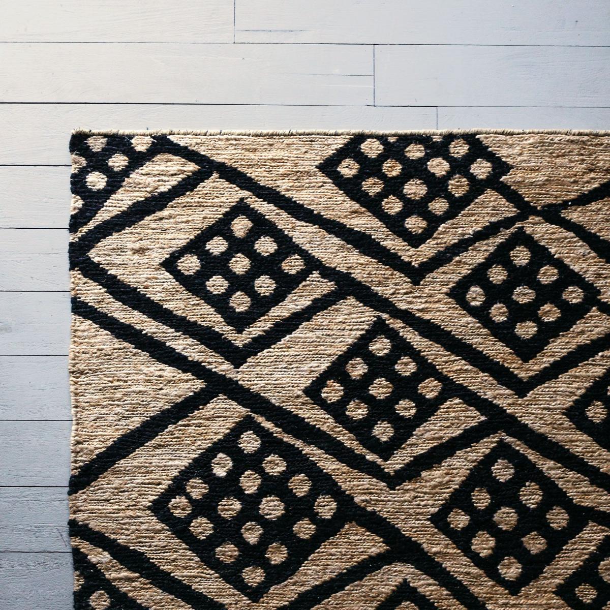 Strong dimensional shapes create energy and impact with this artistic rug. Made of hard wearing jute with a black printed pattern, let the bold design stand out in your interior.