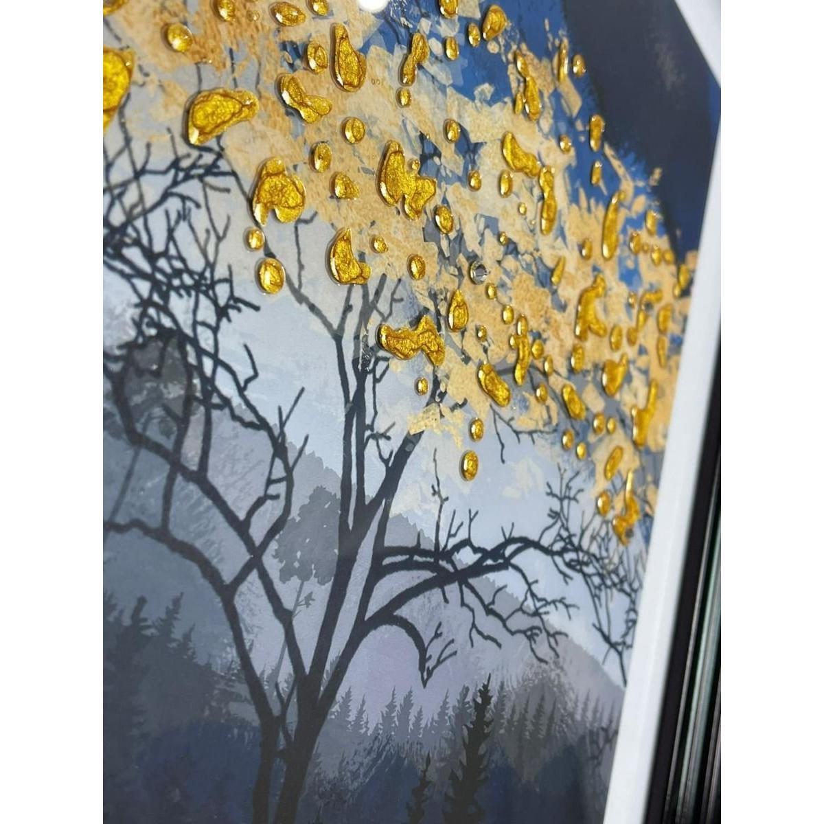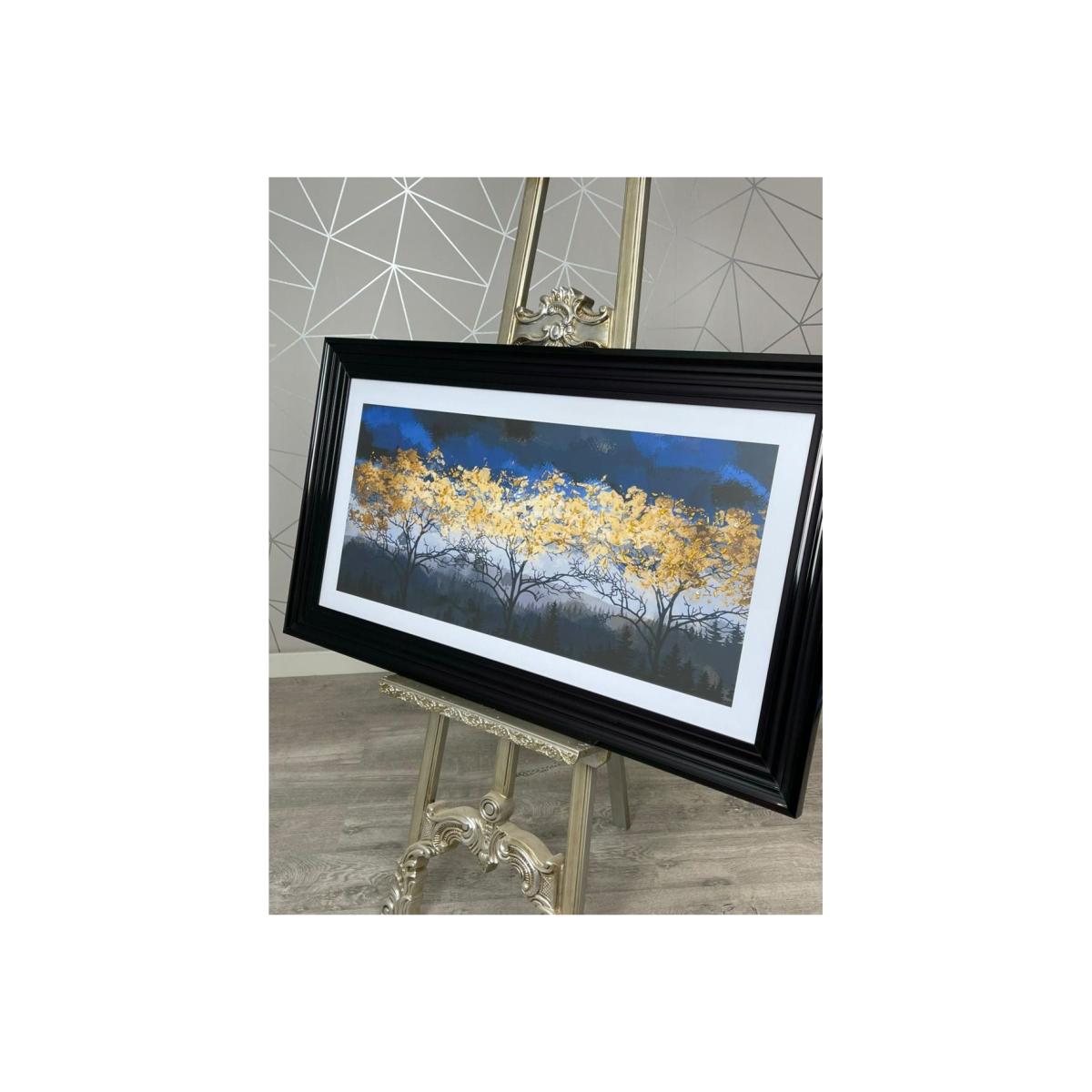 Scenic treeline large wall art boasting modern black frame. The Sapphire Scape is a beautiful art piece featuring a treeline scenic painting. Designed with both deep tonal blues and contrasting golden yellows, this art piece will look perfect in both contemporary and modern spaces. Featuring golden glitter liquid art and black frame.