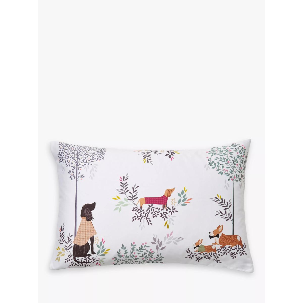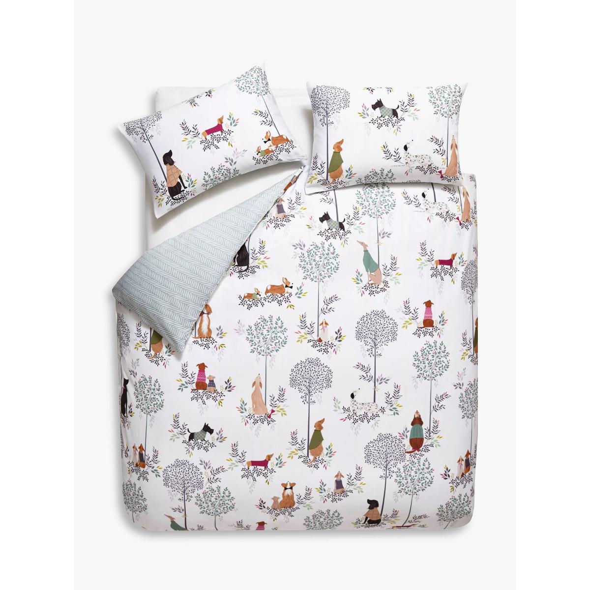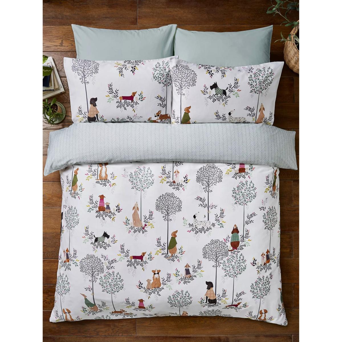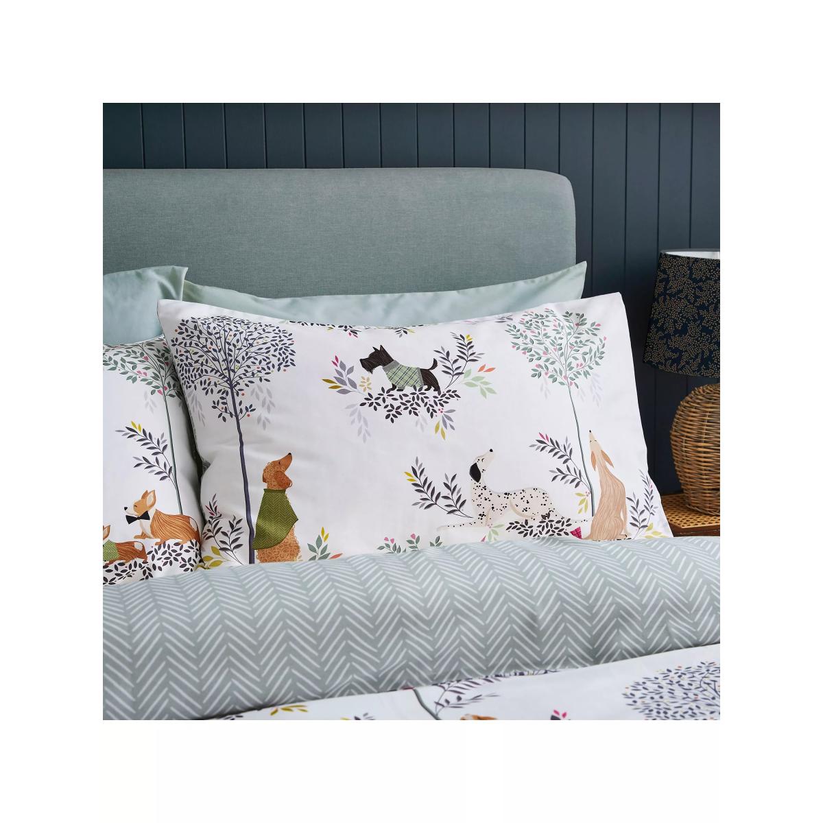 This charming Dapper Dogs duvet cover set from Sara Miller London features array of well-dressed dogs amid amongst beautiful woodland. Printed on plush 220 thread count 100% cotton sateen on crisp white with coordinating soft green herringbone print underside, this playful print will add character to any room. The single size comes with one standard pillowcase. All other sizes come with two standard pillowcases. Bedding sizes To fit duvet/pillow size (cm) Standard pillowcase, L75 x W50cm Single duvet cover, L200 x W137cm Double duvet cover, L200 x W200cm King duvet cover, L220 x W225cm Super King duvet cover, L220 x W260cm
