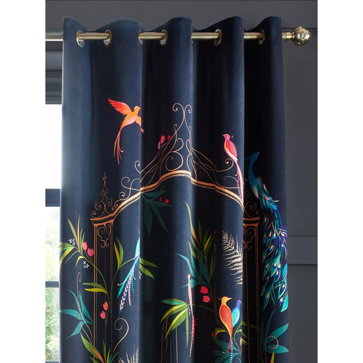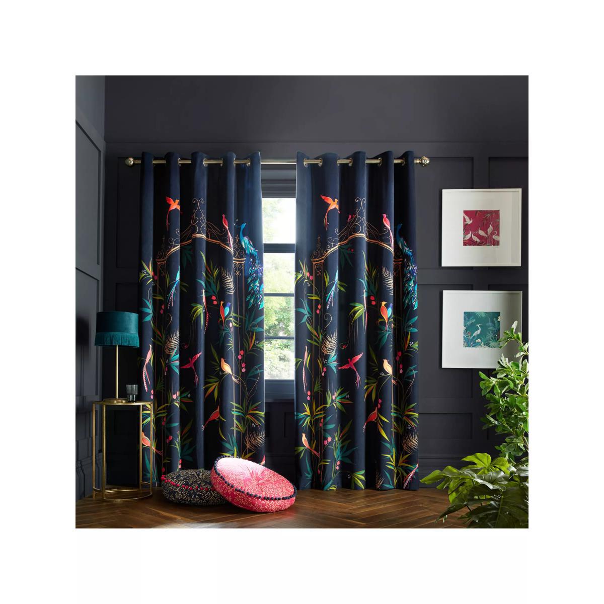 Designs by Sara Miller always make a statement with vibrant colours and beautiful subjects. These Enchanted Gate eyelet curtains have a deep navy background with colourful tropical birds perching amongst ornate gates and lush foliage. Made from sumptuously soft velvet they'll bring a luxurious look and feel to your home. The width stated indicates the size of one curtain panel when laid completely flat. This pack contains two panels and the track/pole length we've recommended allows for the two panels to be gathered when the curtains are drawn. For a fuller look, increase the curtain width. One pair of 167cm width curtains will fit a curtain track/pole size 133-167cm One pair of 228cm width curtains will fit a curtain track/pole size 182-228cm Do you need a curtain pole and accessories? Shop them here.