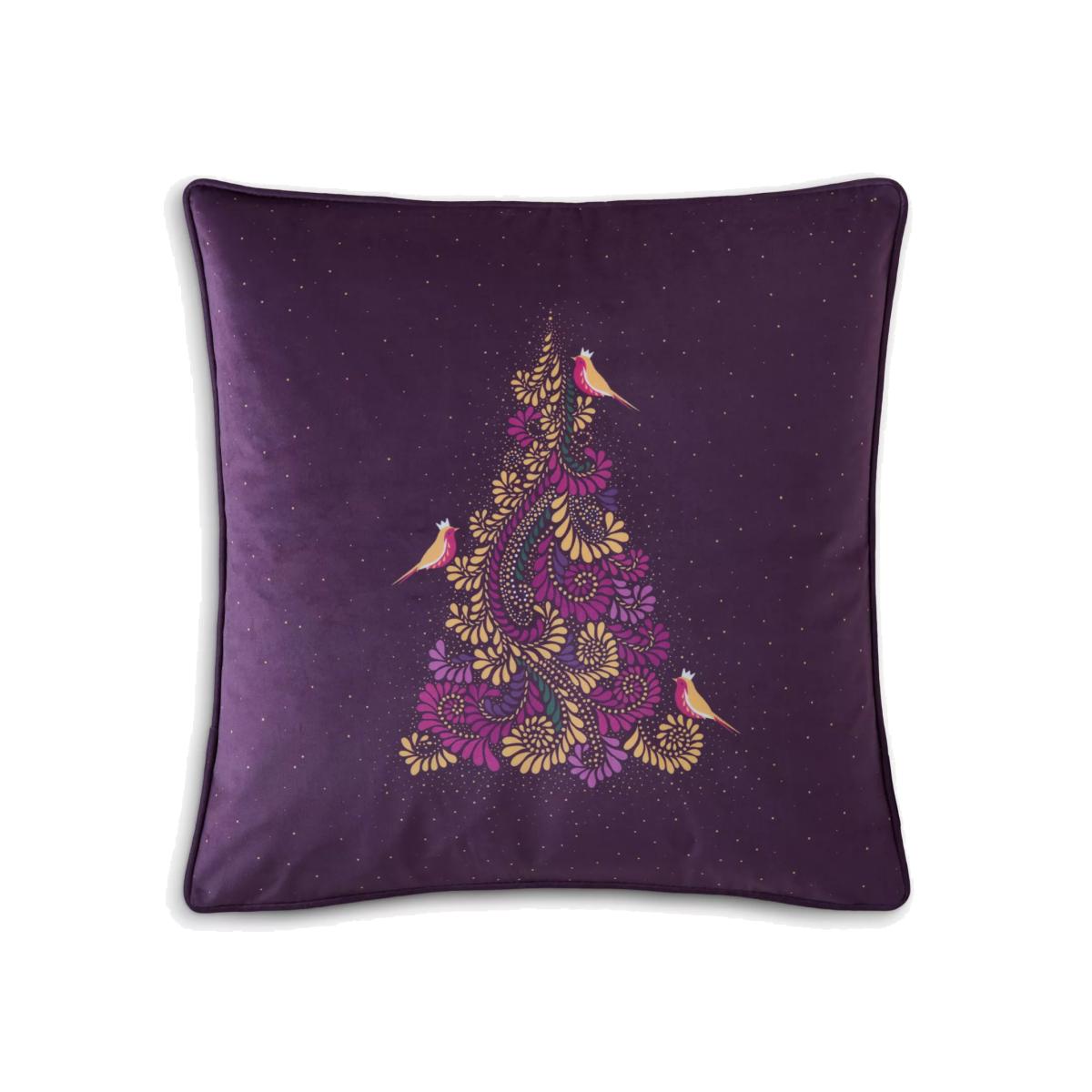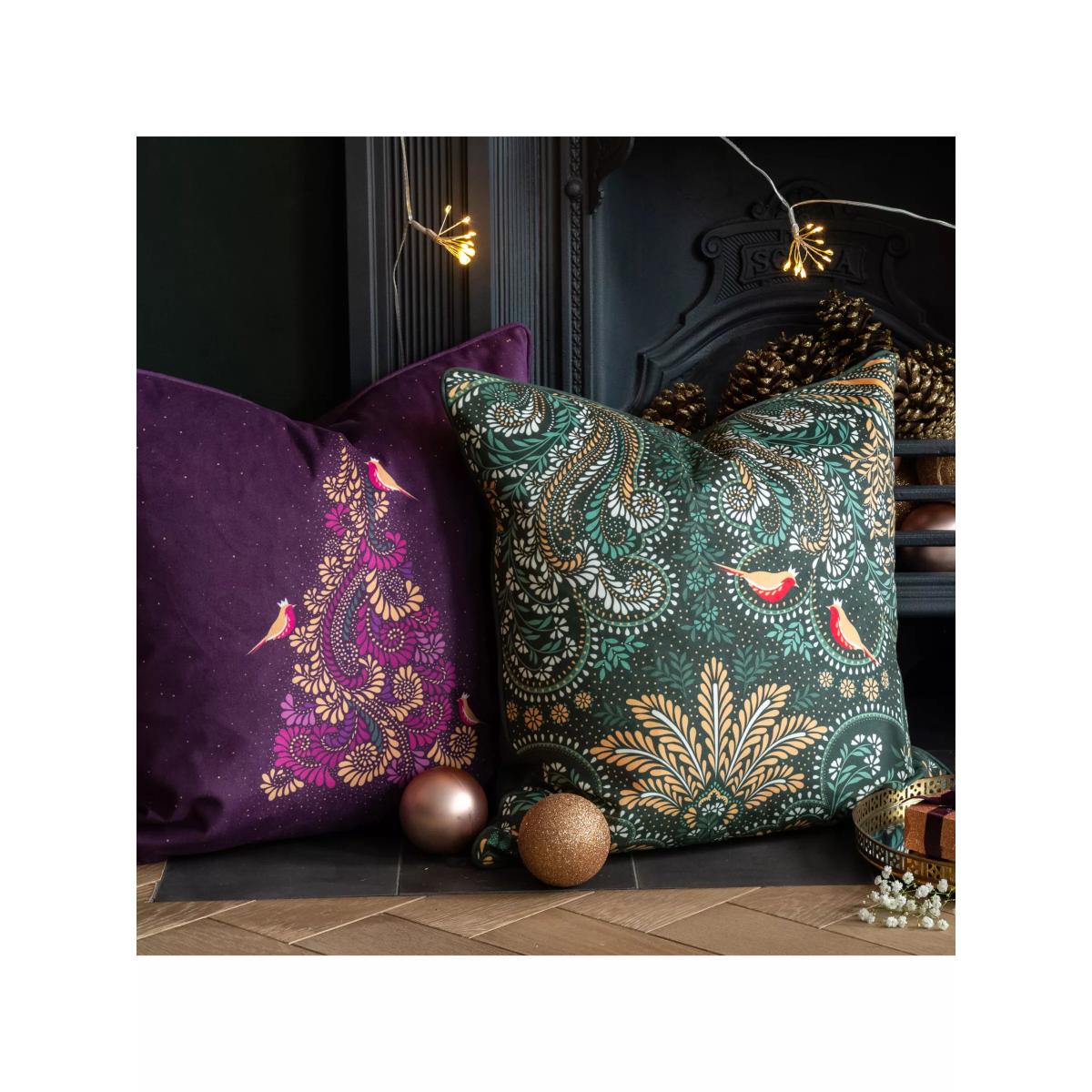 Create a beautifully festive home with this enchanting Filigree Tree Cushion. This luxurious feather-filled velvet cushion, with coordinating piping detail, features robins resting in an ornate Christmas tree of scrolling ferns and will add a touch of winter elegance to your home.