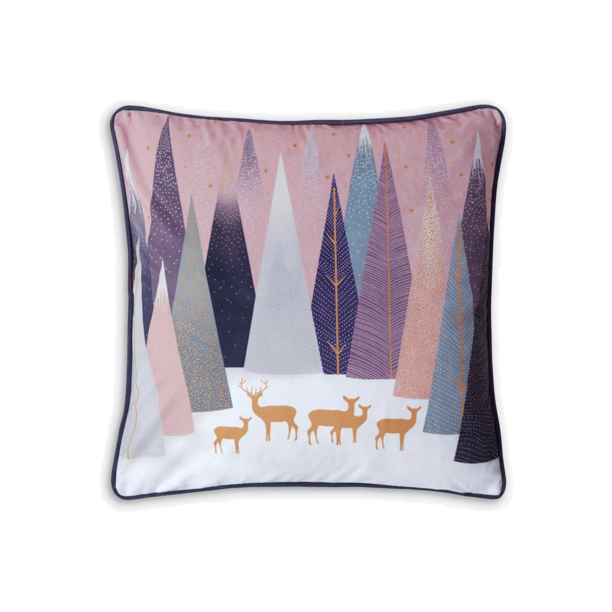 Add some festive charm to your sofa with this sumptuous velvet deer cushion from Sara Miller London. Featuring deer nestled amid a winter forest of enchanting soft pink hues and shimmering snow, this elegant design with coordinated piping detail is the perfect addition for a stylish home this winter.