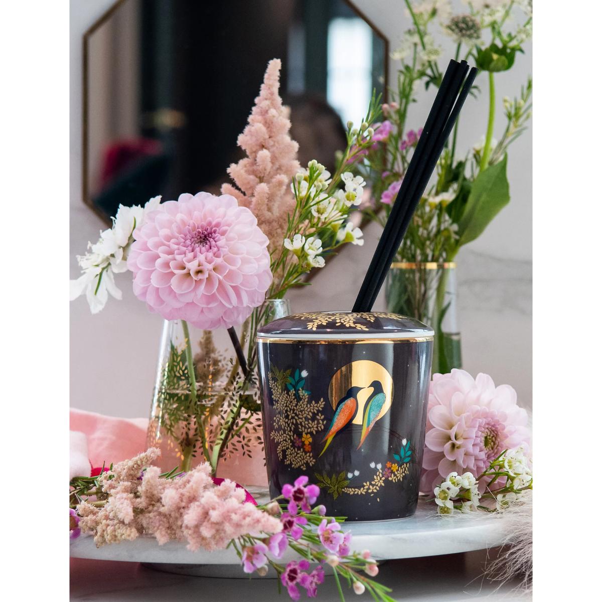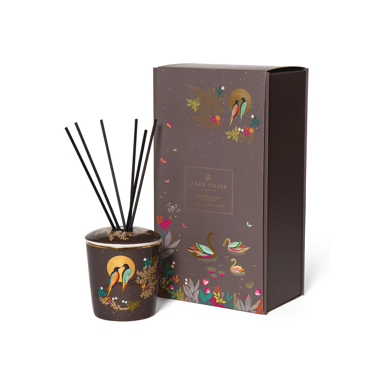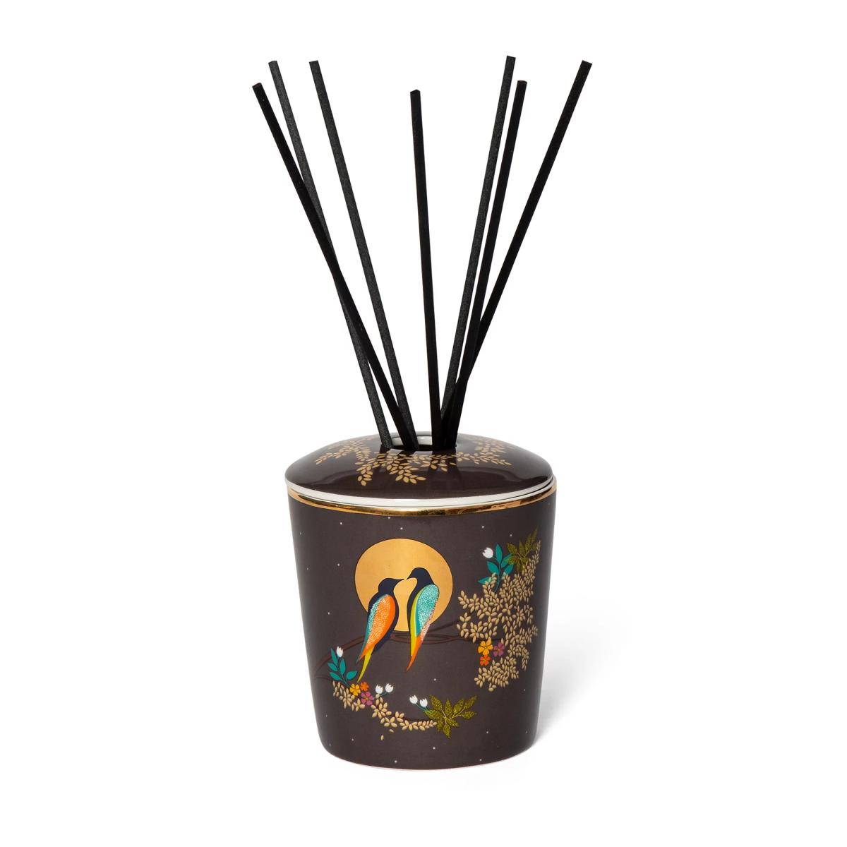 This diffuser from Sara Miller comes complete with elegant black reeds for a striking look. The alcohol-free fragrance combines notes of geranium, patchouli and vetivert, complemented by warm oud and honeyed praline. Notes of jasmine and Asian rose provide a fresh, floral tone to the scent. Its ceramic vessel is embellished with a bold design of birds by moonlight.