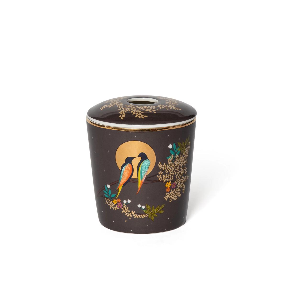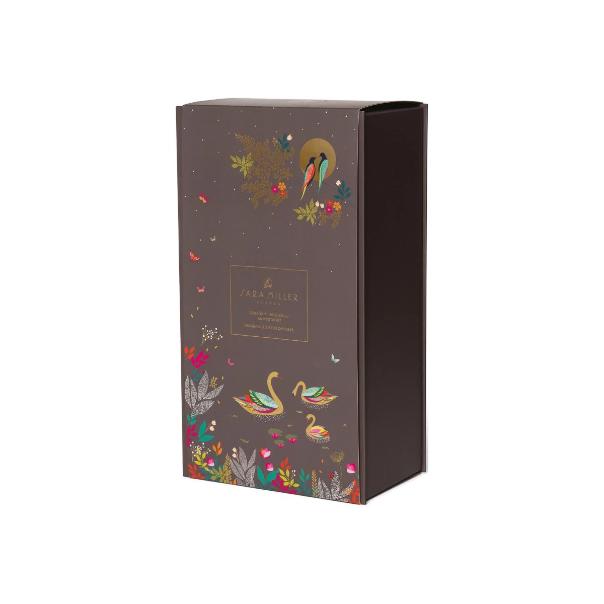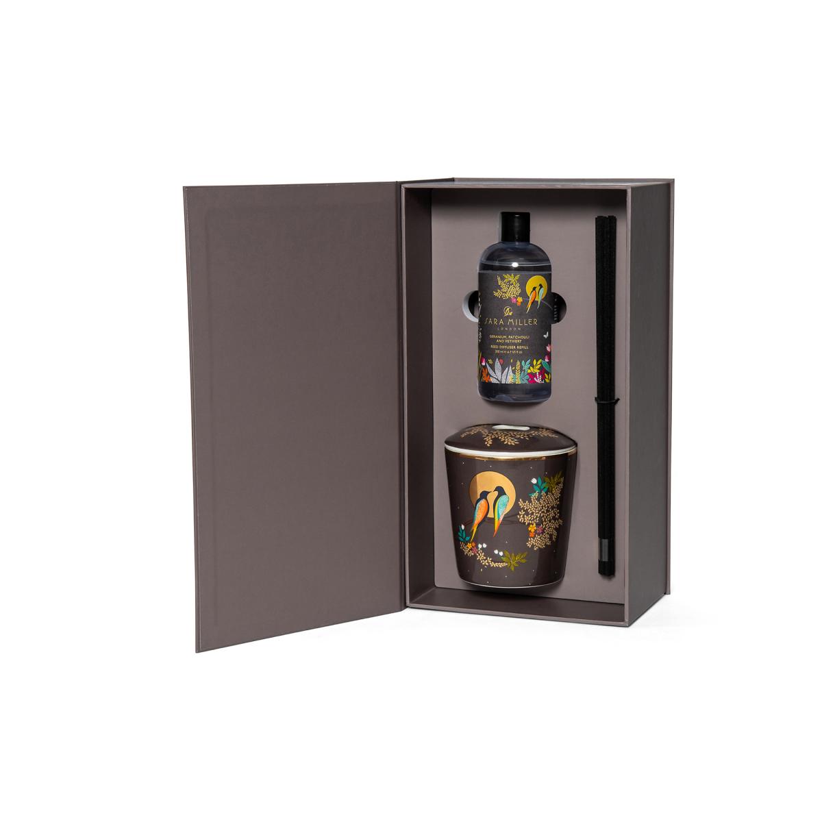 This diffuser from Sara Miller comes complete with elegant black reeds for a striking look. The alcohol-free fragrance combines notes of geranium, patchouli and vetivert, complemented by warm oud and honeyed praline. Notes of jasmine and Asian rose provide a fresh, floral tone to the scent. Its ceramic vessel is embellished with a bold design of birds by moonlight.