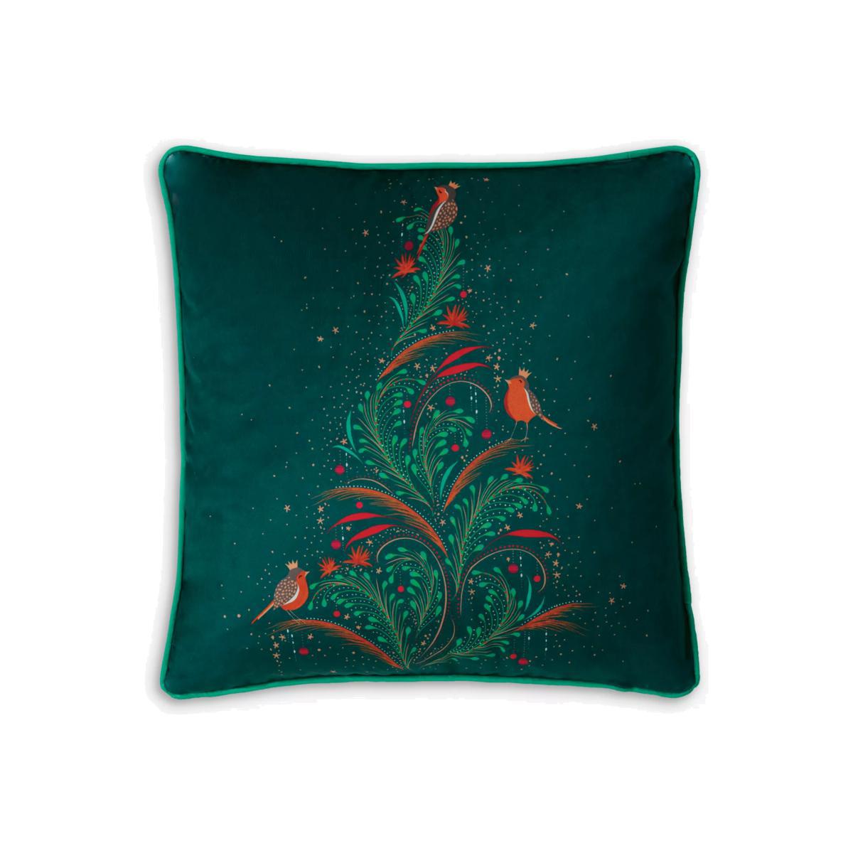 A sumptuously soft velvet Sara Miller London cushion featuring a pair of robins perched amid the branches of an ornate Christmas tree. Perfectly finished with contrasting piping detail, this rich forest green feather-filled cushion will bring festive warmth and cheer to your home this Christmas.
