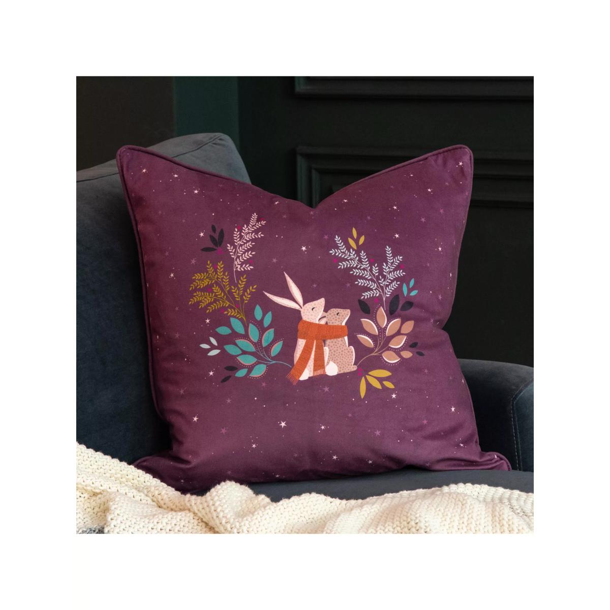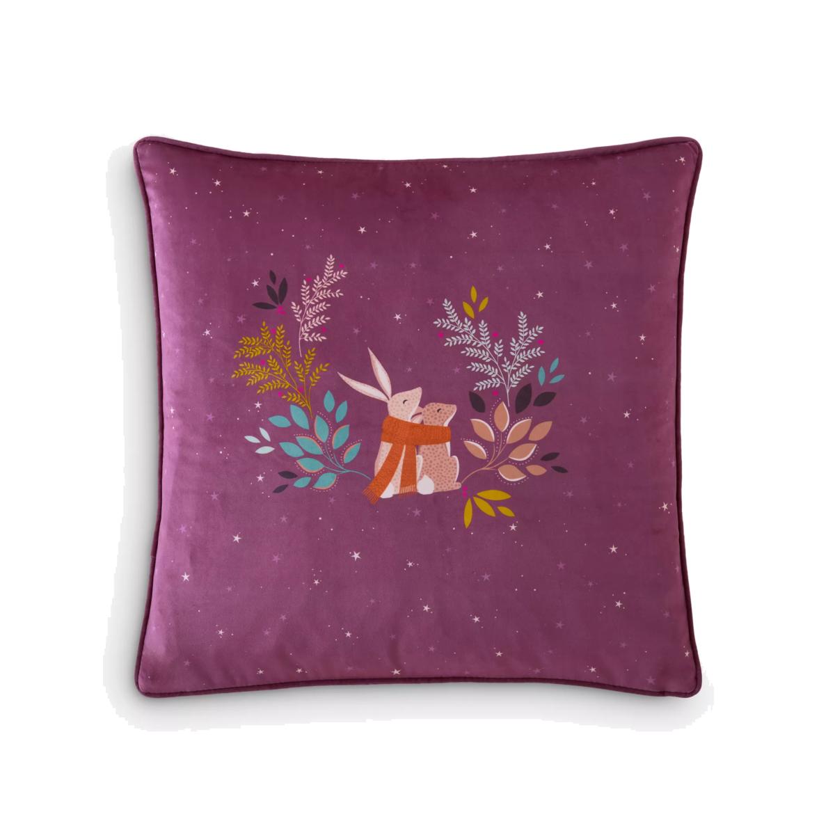 Add festive charm to your sofa or bed with this Woodland Tales Cosy Rabbits velvet cushion from Sara Miller London. This luxurious warm plum, feather-filled cushion, trimmed with coordinating piping detail, will bring a touch of winter magic to your home.