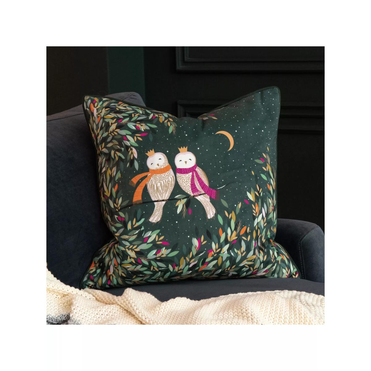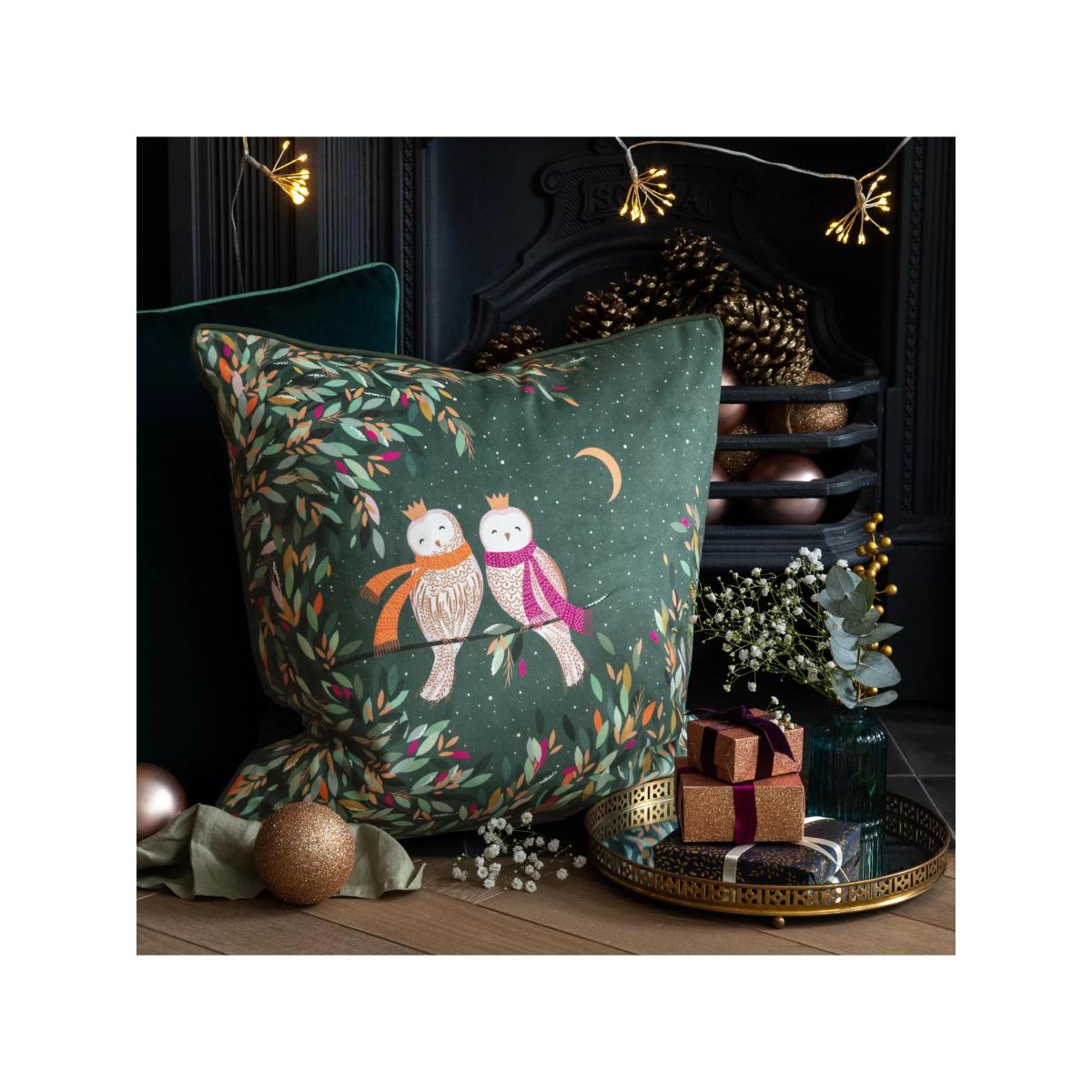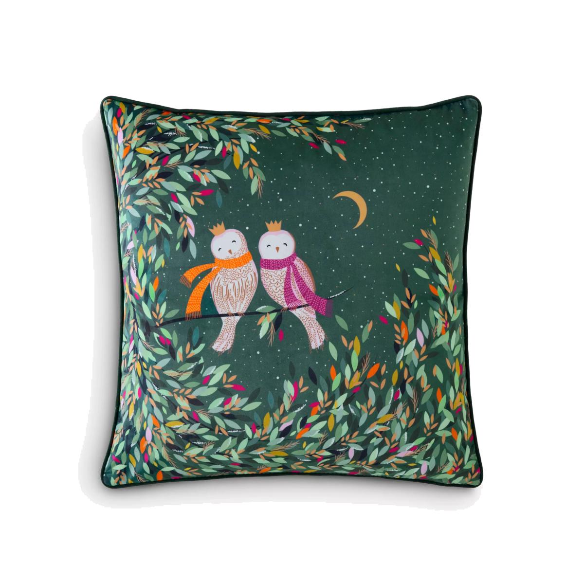 This luxurious velvet cushion from Sara Miller London features characterful owls perched amongst colourful winter trees in a rich forest green. Trimmed with coordinating piping, this charming feather-filled cushion is certain to bring some festive fun to your home this winter.