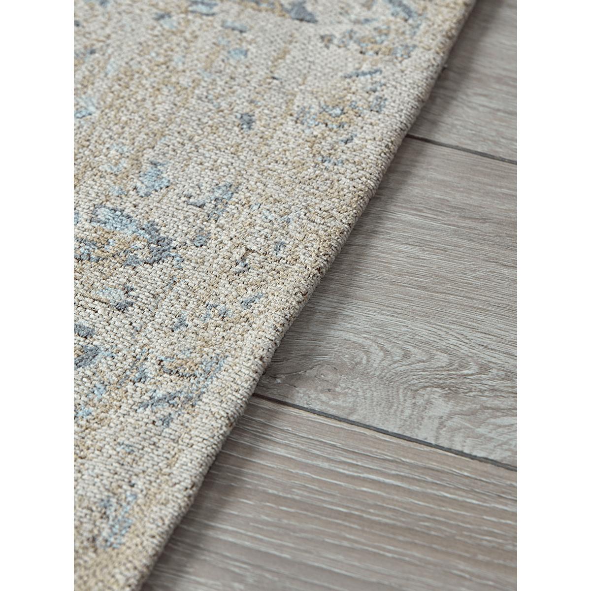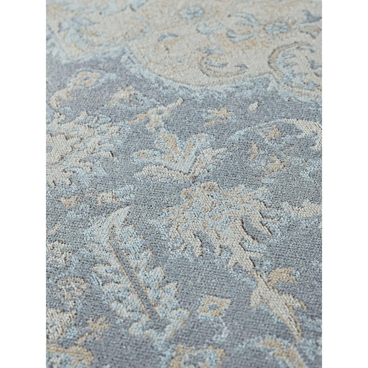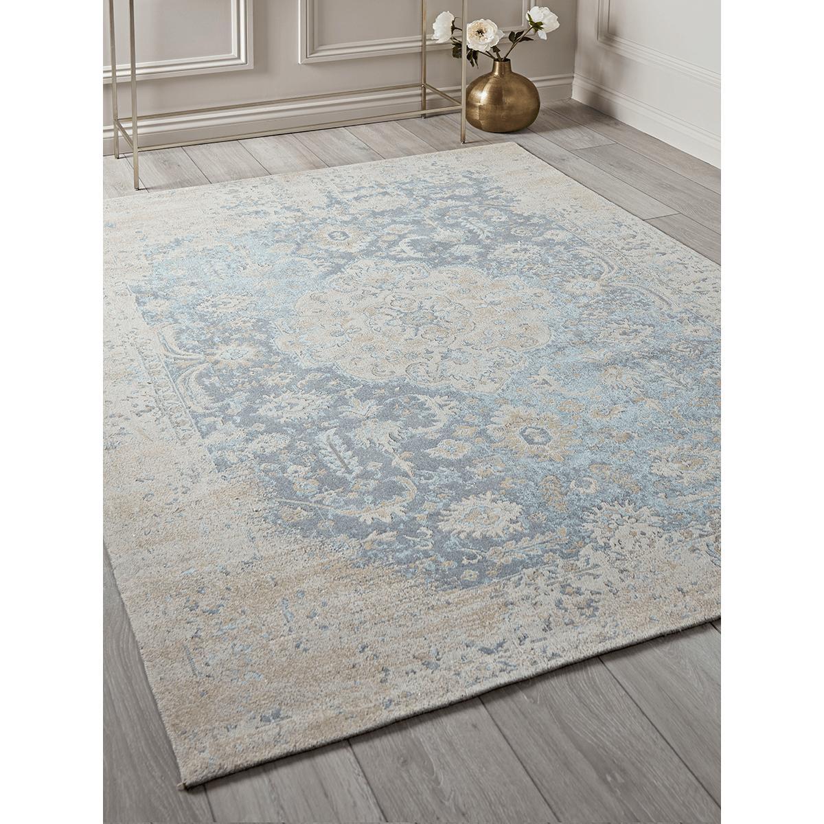 Woven from cotton chenille with a vintage-inspired faded design, our muted blue-grey rug will anchor any scheme - be it traditional or modern - by a sense of grandeur and authenticity. Weighty and luxurious, this decorative rug has a very soft sheen.