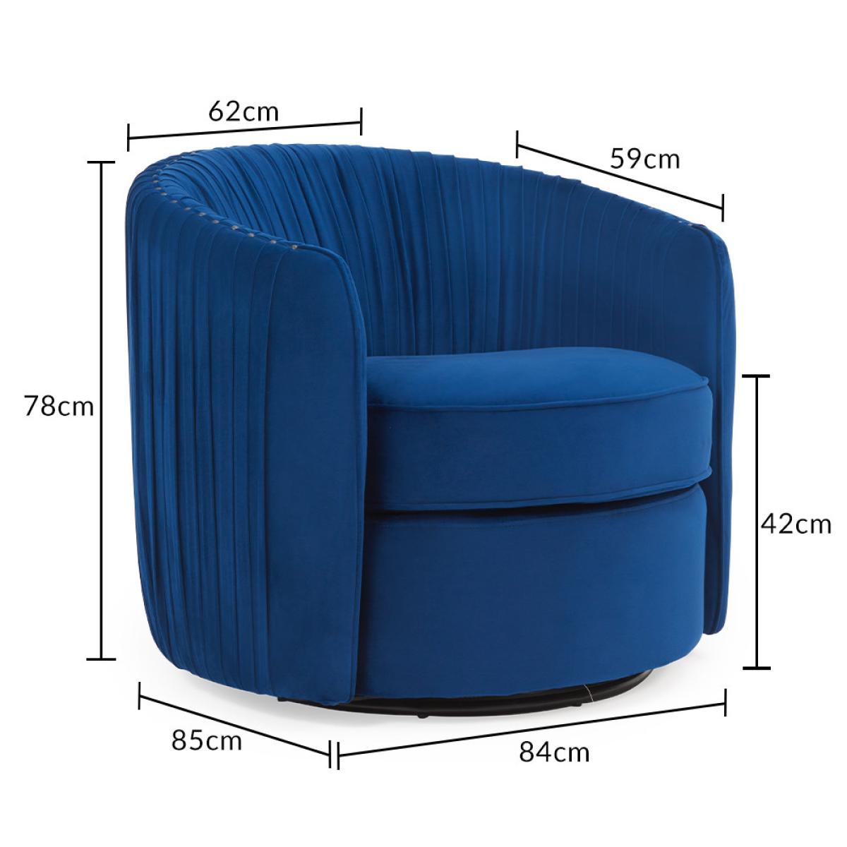 Chic and elegant, the Sarah Blue Velvet Swivel Chair is a stylish asset for any living space. Upholstered in smooth, rich blue velvet, the swivel chair features a retro-style pleated design for a stunning look that's sure to leave a lasting impression. A beautiful example of stylish and functional design, the tub style dining chair is complete with a practical swivel feature. The Sarah Velvet Swivel Chair is also available in grey or green.