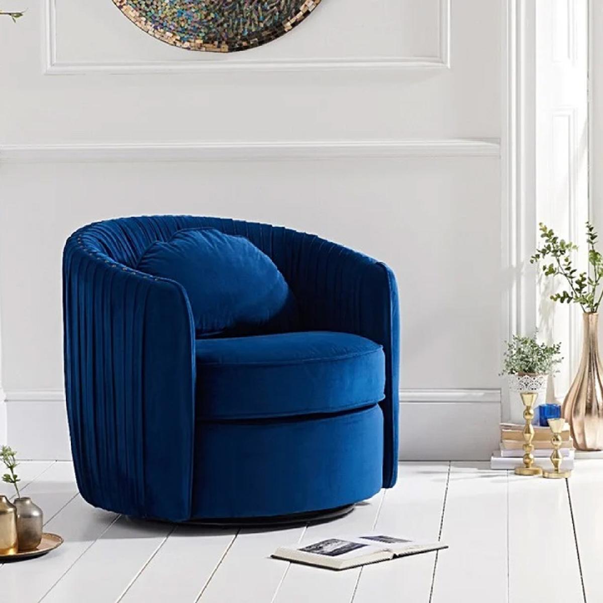I love this blue velvet swivel from the accent chairs category for its rich colour and plush texture, which instantly elevates the vibe of any room. It works well in both modern and traditional interiors, adding a pop of colour without overwhelming the space. Practical styling tips include placing it near a window or reading nook for comfort, and pairing it with neutral tones or metallic accents to balance the bold hue. Because of its rounded, compact shape, it’s perfect for smaller living areas or as an occasional seat in a larger scheme. Pair it with a statement cushion or a small side table to complete the look and make it a functional, stylish focal point.