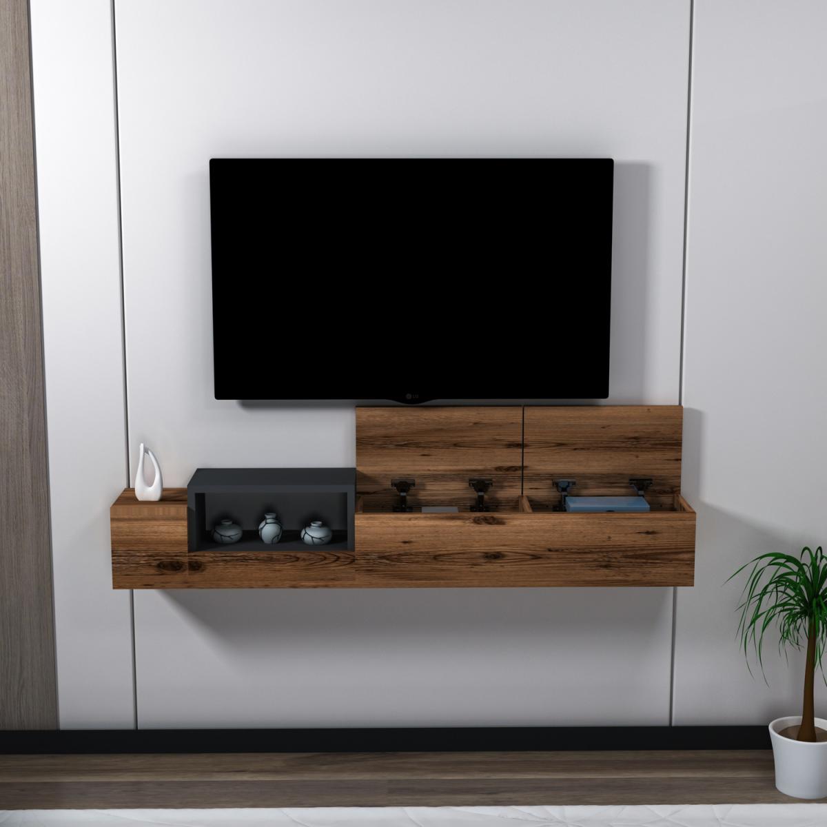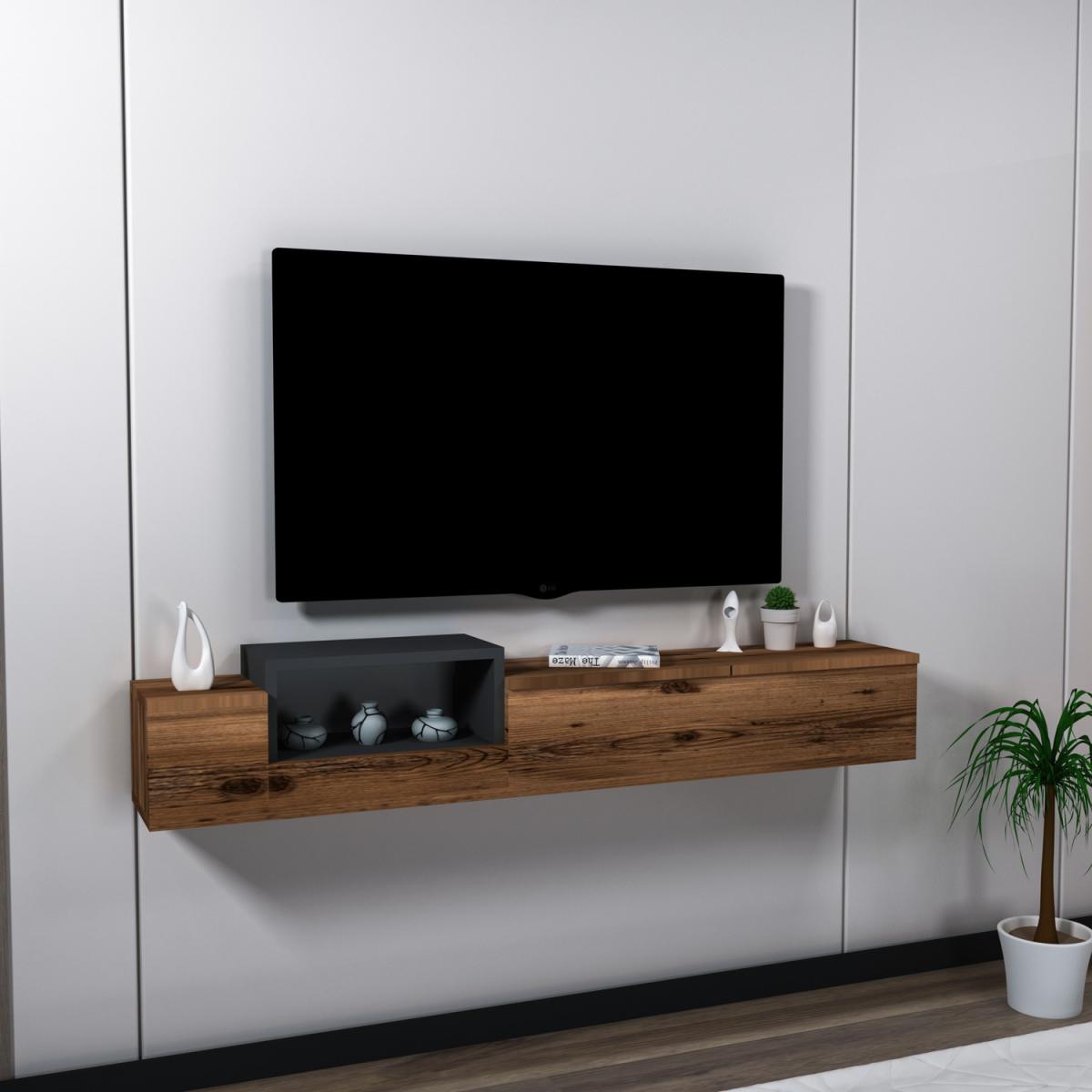 Note that the TV stand is not designed to hold a TV, instead both the stand and the TV must be mounted to the wall separately. MATERIAL The TV stand is made of an 18 mm thick quality melamine-coated particleboard. The manufactured wood surface is water-resistant to some extent and the edges are banded with PVC edge banding tape. First-class assemblyinstallation hardware and accessories are used. Our products are produced from certified quality raw materials that do not contain carcinogenic substances and comply with European Union health norms. CLEANING You can clean your furniture with a dry cloth. Avoid prolonged contact of your product with moisture and water. ASSEMBLY The product will be delivered to the customer in the original package as disassembled. It is designed to be assembled by the customer using a power drill and screwdriver. Assembly instruction and installation hardware are included in the package. For fast and error-free installation, product parts are numbered with stickers in accordance with the assembly guide.