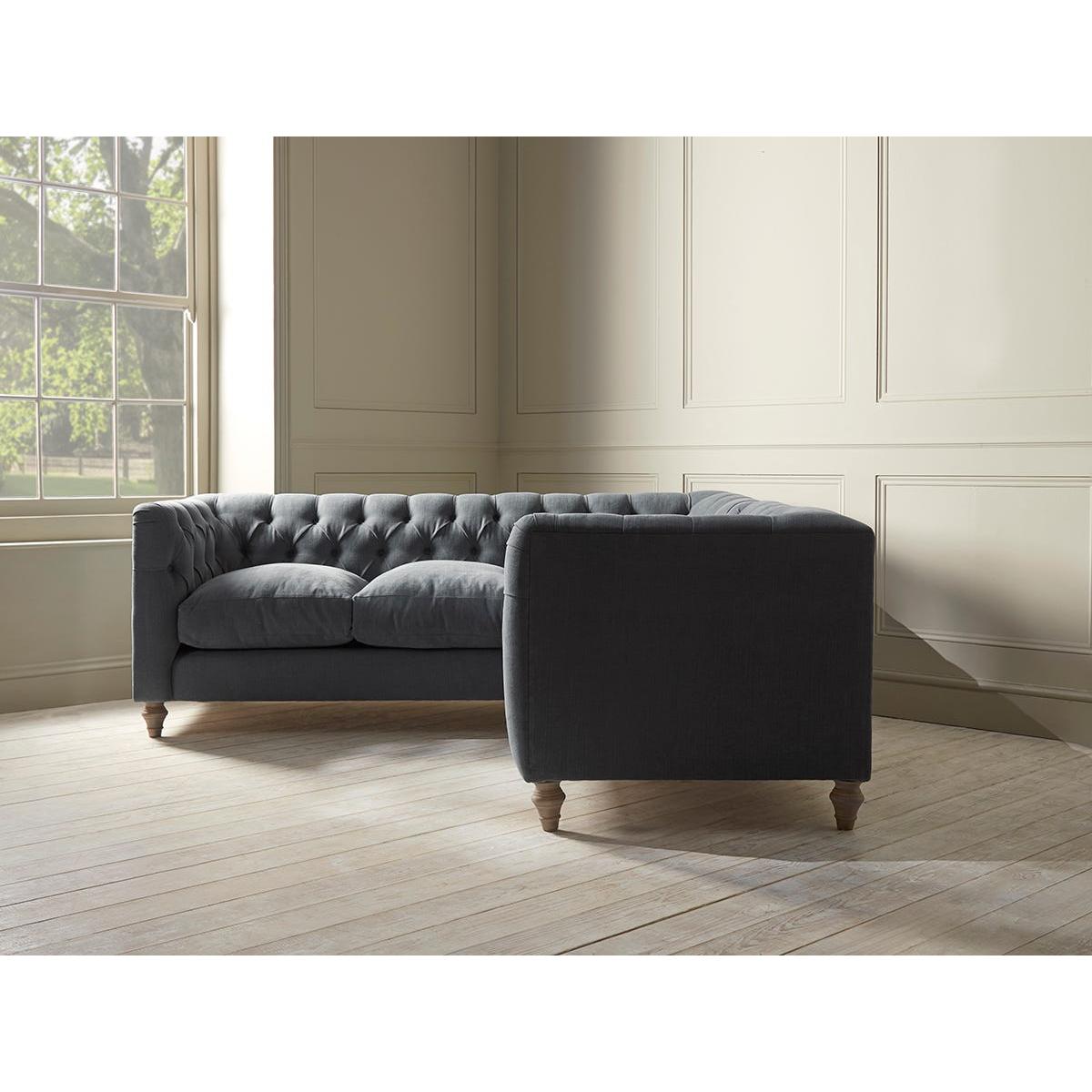 Our Sarnia corner sofa is a visually stunning arrangement of deep plump cushions and hand tufted buttons. With a form that shelters and cocoons, this lovely L-shaped sofa will transform an open plan living space or smart living room with its timeless good looks and robust durability. The Sarnia range includes two seater and three seater sofas as well as a corner sofa, a loveseat and an ottoman. Our Sarnia collection can be upholstered in a choice of 33 distinctive shades and five fabrics to suit your style. Read our Upholstery FAQs View our full Upholstery Terms and Conditions