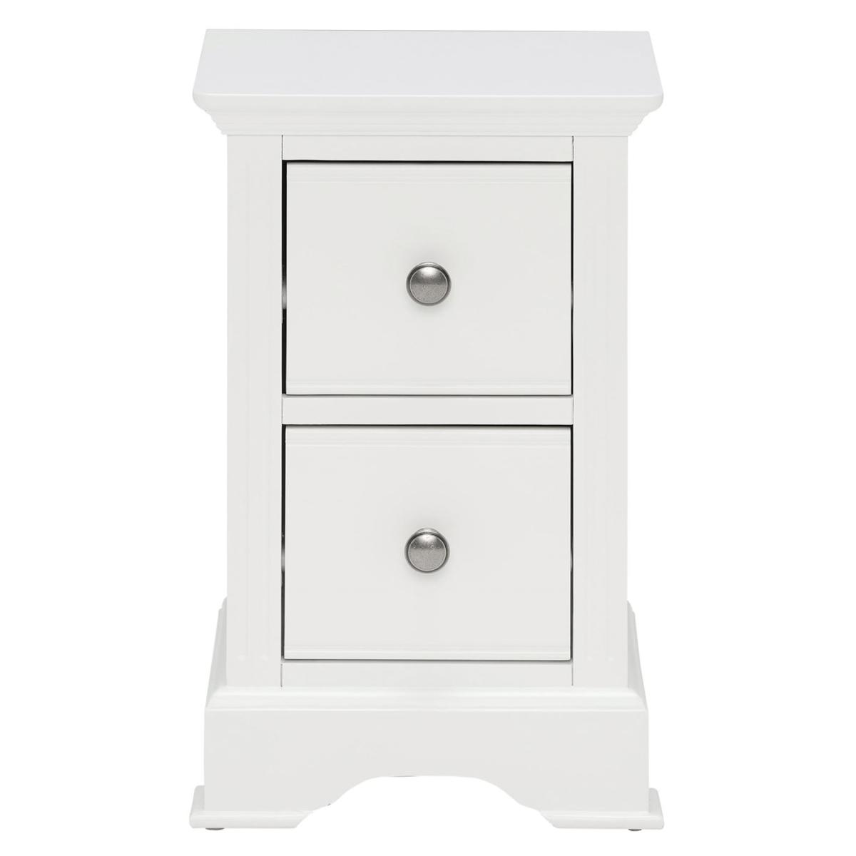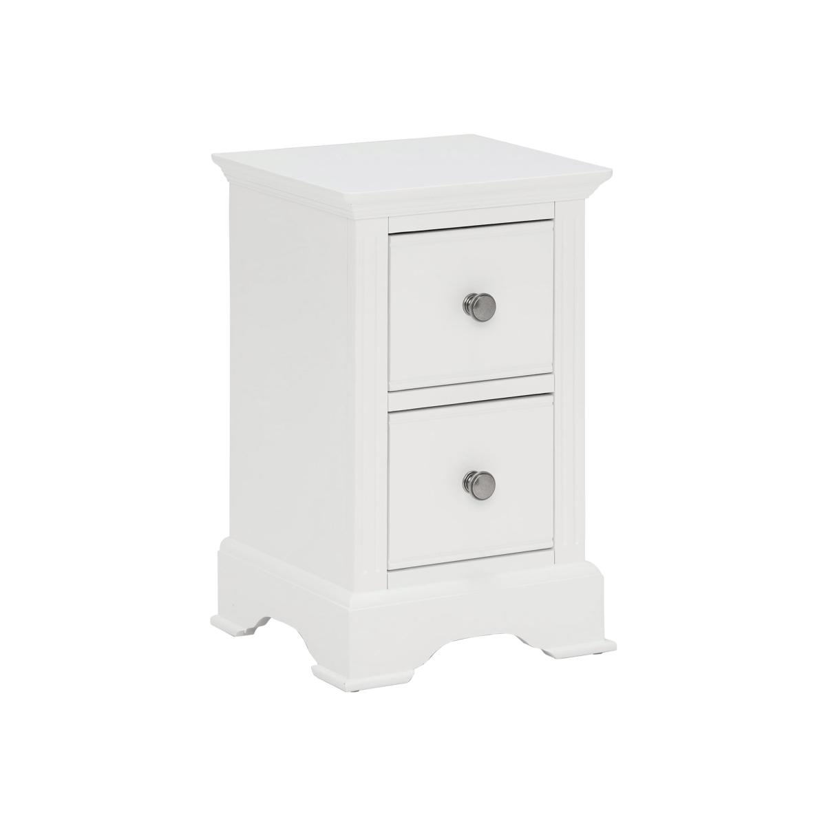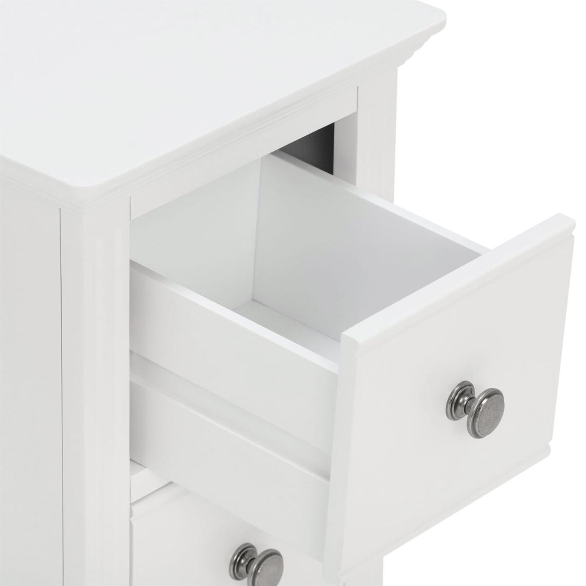 I love this little bedside table for its classic, versatile design and clean white finish, which makes it easy to incorporate into a variety of interiors. It works particularly well in traditional or cottage-style bedrooms but can also add a fresh touch to seaside, coastal, or even Scandinavian-inspired schemes. Practical styling tips include pairing it with soft textiles such as linen or cotton bedding for a relaxed look, and accenting with simple table lamps or natural accessories like potted plants or a stack of favourite books. Its compact size makes it ideal in smaller spaces, while the two drawers offer handy storage for essentials without cluttering your room.