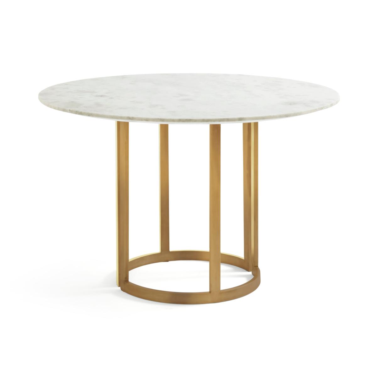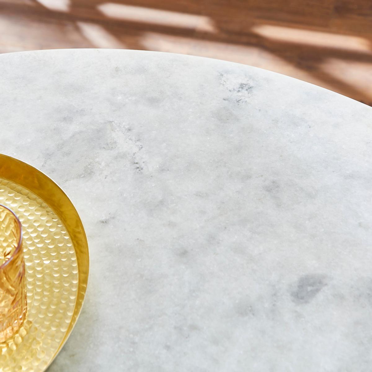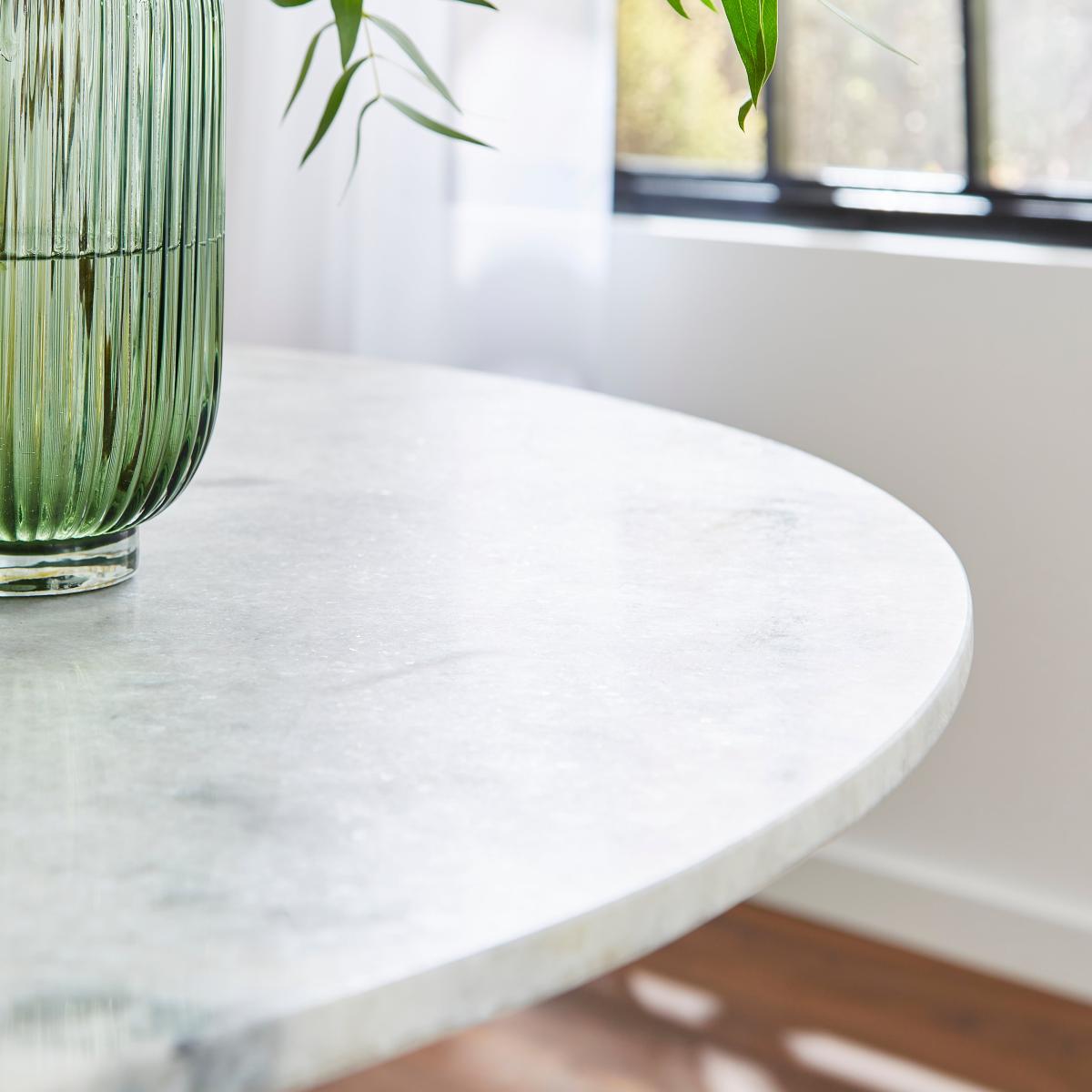 This stunning table features a real marble top and a brass effect frame, creating a harmonious blend of style and opulence. Its compact design comfortably seats up to 4 people, making it an excellent choice for intimate gatherings and cosy meals. The round shape encourages conversation and creates an inviting atmosphere in your dining room. Please note this table is made from solid, true marble, which is a naturally heavy material. We highly recommend having at least 3 people available to move and build the tables safely. We would like to remind our customers that marble is a natural stone, and as such, no two tables will be exactly alike and the product you receive may not exactly match the image shown on our website. Every piece of marble has its own unique variations in colour, veins, fissures and pores, which adds to its beauty and character. Any slight openings in the fissures are normal and not considered a defect. Please follow our care instructions to keep your product in its best condition: As a soft stone, marble can be susceptible to chips, cracks, scratches, and discoloration, so it's important to care for it properly. We recommend cleaning the table with a damp cloth using warm water or a specialist marble cleaner, then buffing it dry. Please remember that marble surfaces are porous, so it's crucial to remove spillages immediately to avoid stains, and we recommend using coasters and place mats to protect against heat and moisture. Do not use knives to cut food on the marble tabletop, use it as a work top, place heavy weights on it, or use acidic or abrasive cleaners. Just like glass, you should never sit or stand on a marble surface.