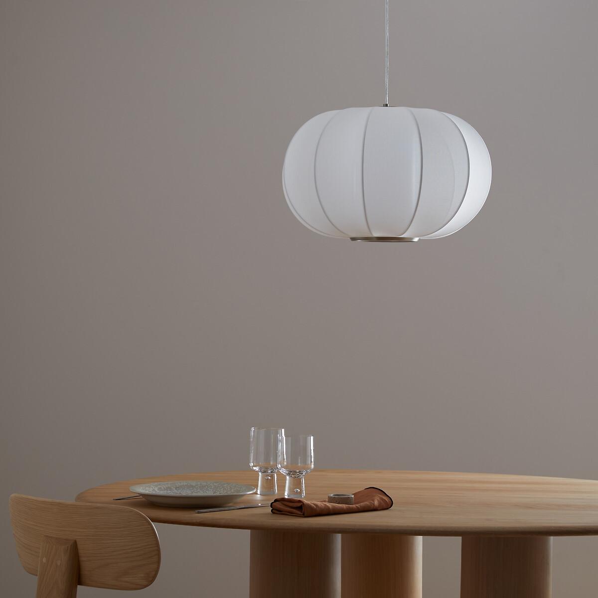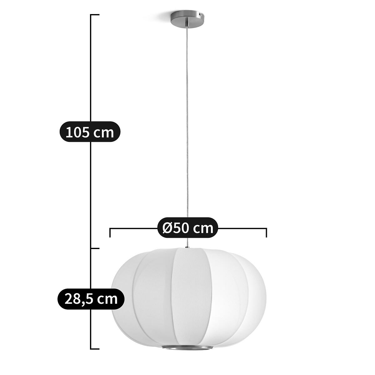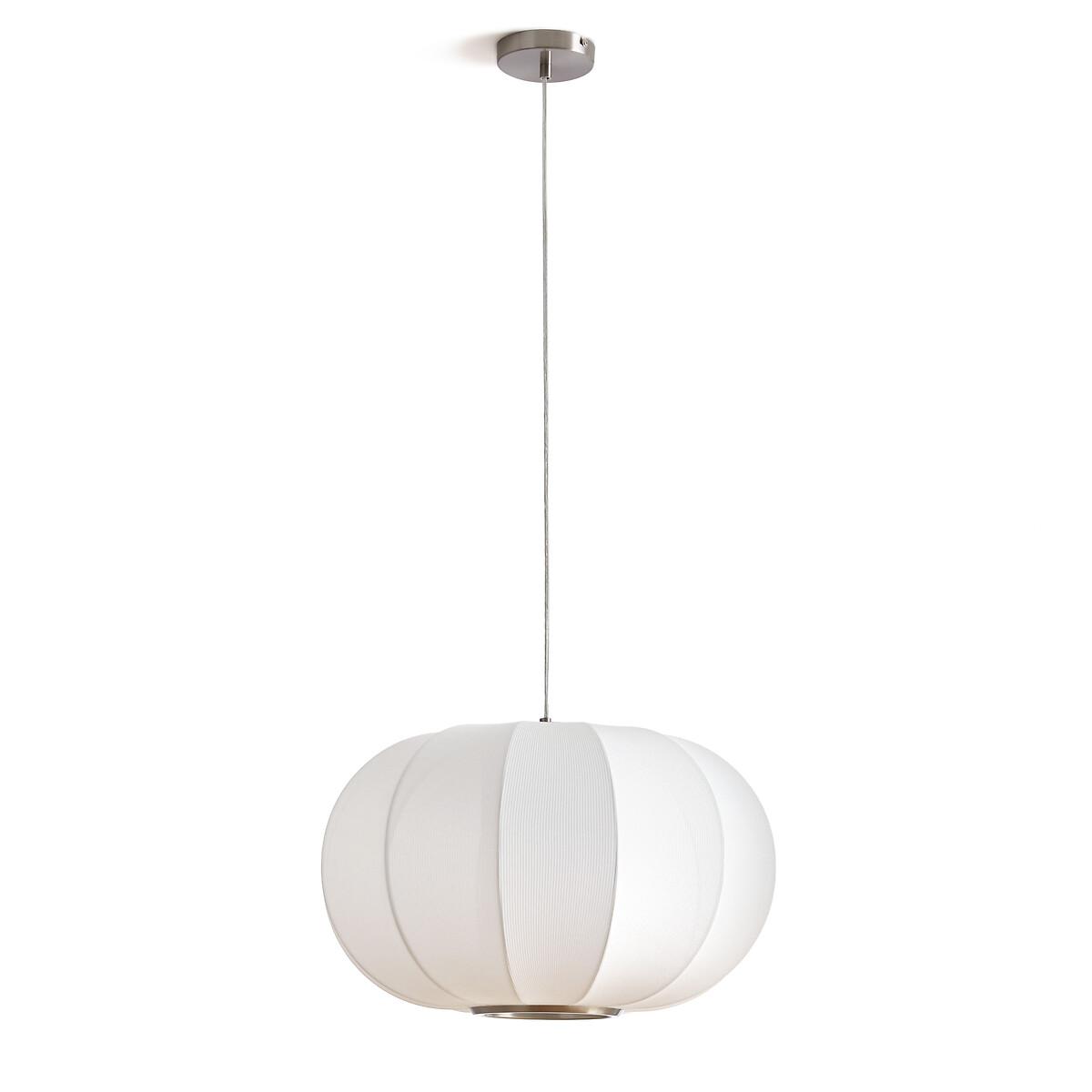 Inspired by traditional Japanese lanterns, Satchi is a contemporary ceiling light with soft and delicate lines. Hang install alone or in a group. The lampshade is round and slightly flattened, letting diffused light pass through its light, finely fluted fabric.. An exclusive design signed by AMPM.Product Details • Lampshade stretch fabric 84% polyamide, 16% Spandex • Internal PVC diffuser • Satin nickel finish iron plate • Compatible with E27 bulb (not included) • For bulb (not included):8W maxDimensions Lampshade • Diameter 50cm • Height: 28.5cm • Cable length: 105cm. Dimensions and weight of parcel 1 parcel • L55 x H36 x D55cm. 2.8kg