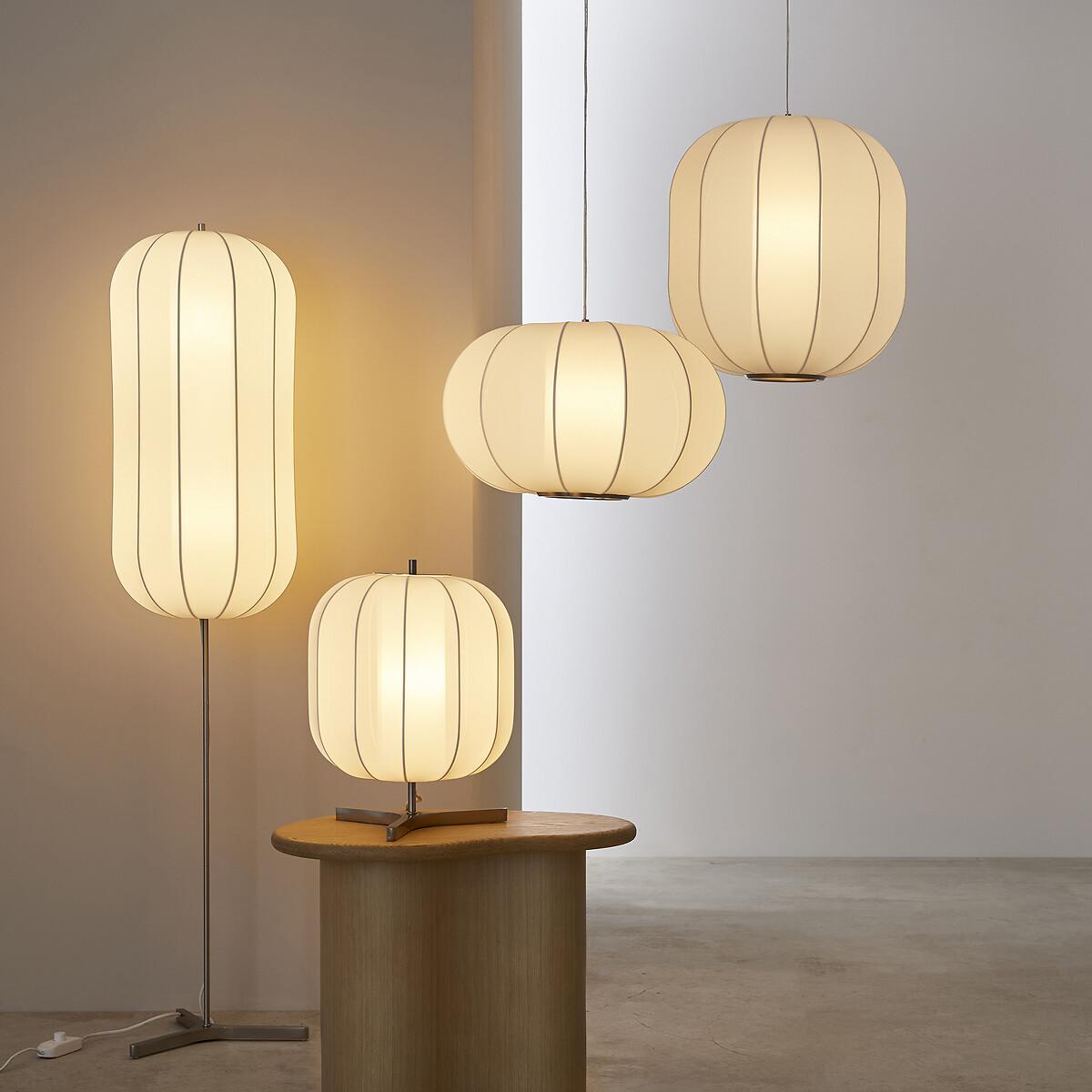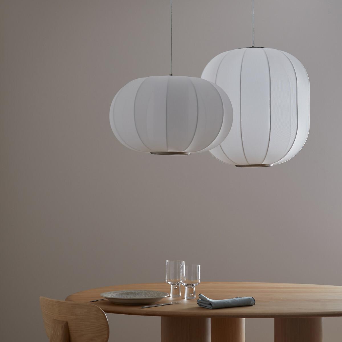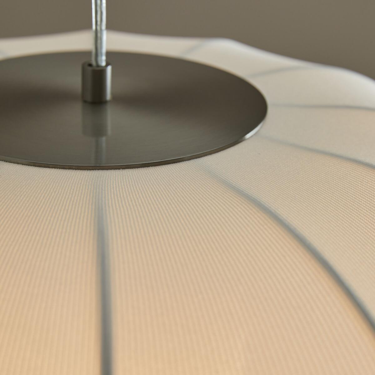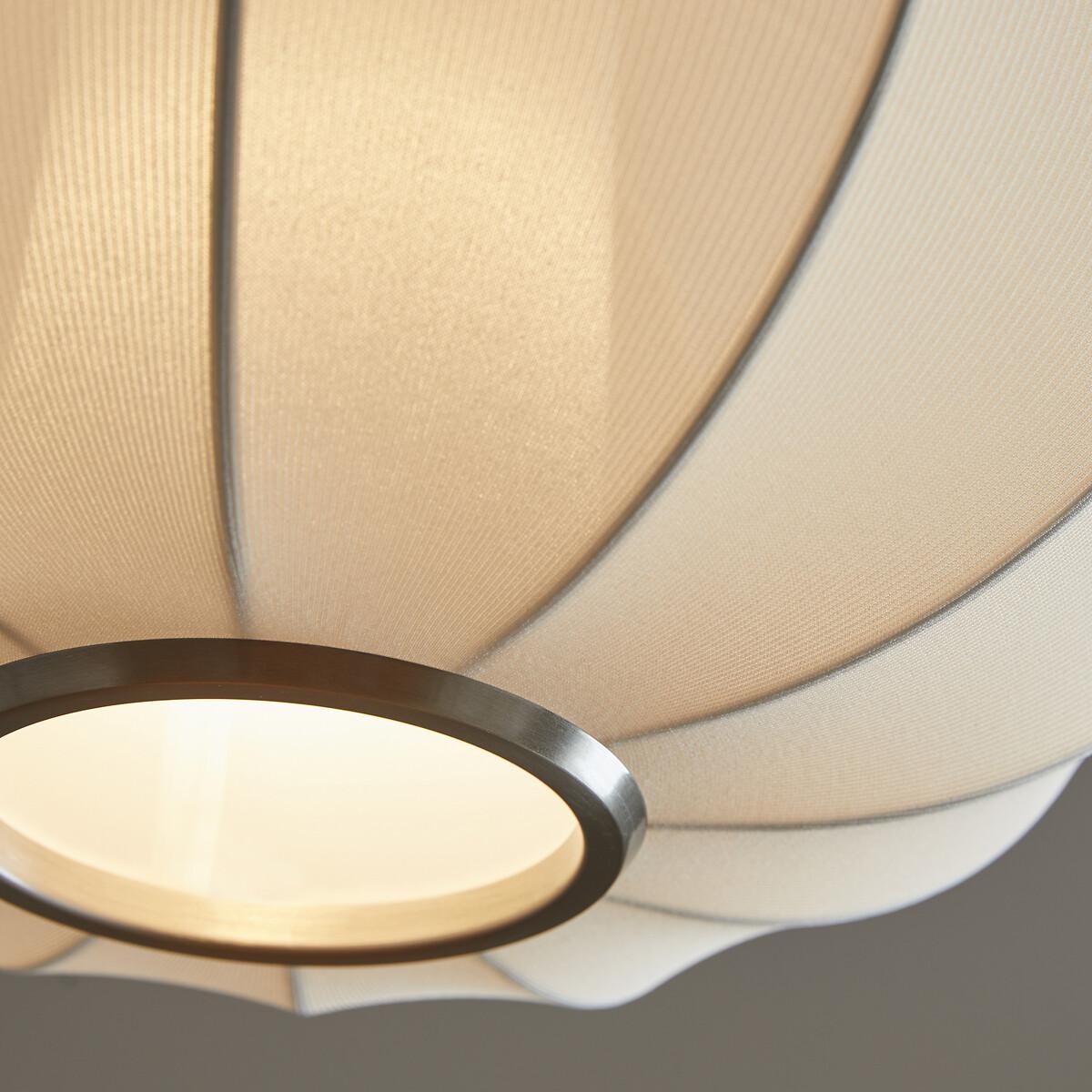 Inspired by traditional Japanese lanterns, Satchi is a contemporary ceiling light with soft and delicate lines. Hang install alone or in a group. The lampshade is round and slightly flattened, letting diffused light pass through its light, finely fluted fabric.. An exclusive design signed by AMPM.Product Details • Lampshade stretch fabric 84% polyamide, 16% Spandex • Internal PVC diffuser • Satin nickel finish iron plate • Compatible with E27 bulb (not included) • For bulb (not included):8W maxDimensions Lampshade • Diameter 50cm • Height: 28.5cm • Cable length: 105cm. Dimensions and weight of parcel 1 parcel • L55 x H36 x D55cm. 2.8kg
