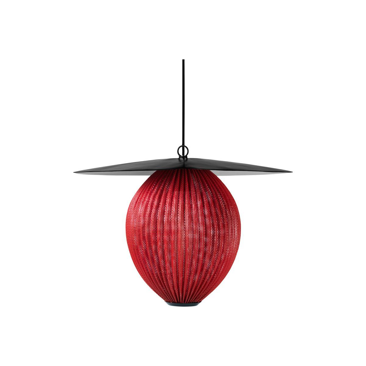 The Satellite Collection of two pendant lamps with geometrical shapes and an organic shade is designed by Mathieu Matégot in 1953 to create outstanding sculptural aesthetics. The name, Satelitte, was given by Matégot as a wink and tribute to the scientific progress in France in the years after the Second World War. The Satellite Collection holds the distinctive trait of Rigitulle, a technique and material invented by the designer himself that makes it possible to bend and fold the fabric. Like metal sheet to an original, oblong shaped pendant lamp. The lampshade has five colour options and is unique with its bulb all covered by perforated metal to exude an atmospheric light – creating a festive appearance. The interplay of light and shadow casted on walls and floors generate a dramatic feature in any dining room, hallway or restaurant. Hang the satellite Pendant Lamp alone as a characteristic piece or in multiples to create a cloud of luminosity.