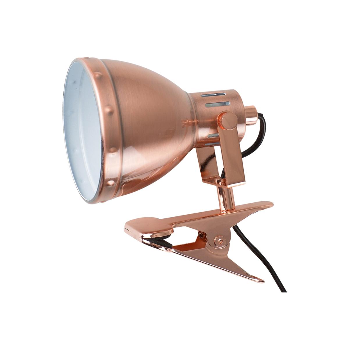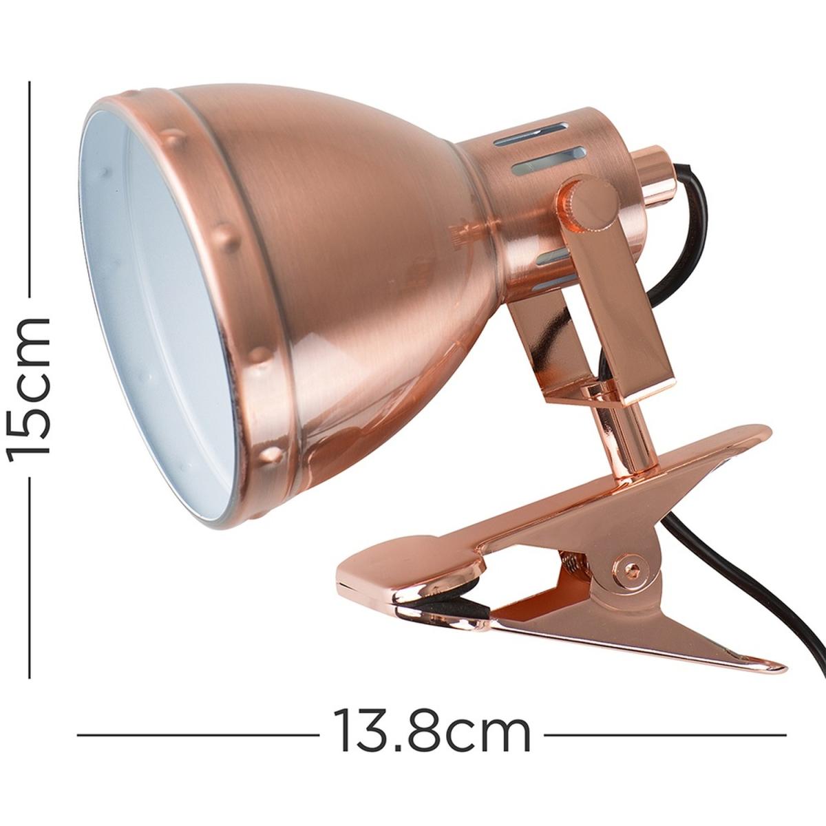Retro style domed shaped clip on spotlight in a satin copper effect metal finish. The clamp is ideal for clipping onto hard surfaces for reading, writing and other tasks. Adjustable spotlight head, direct the light where it is required. Also features an in-line onoff switch for easy use.