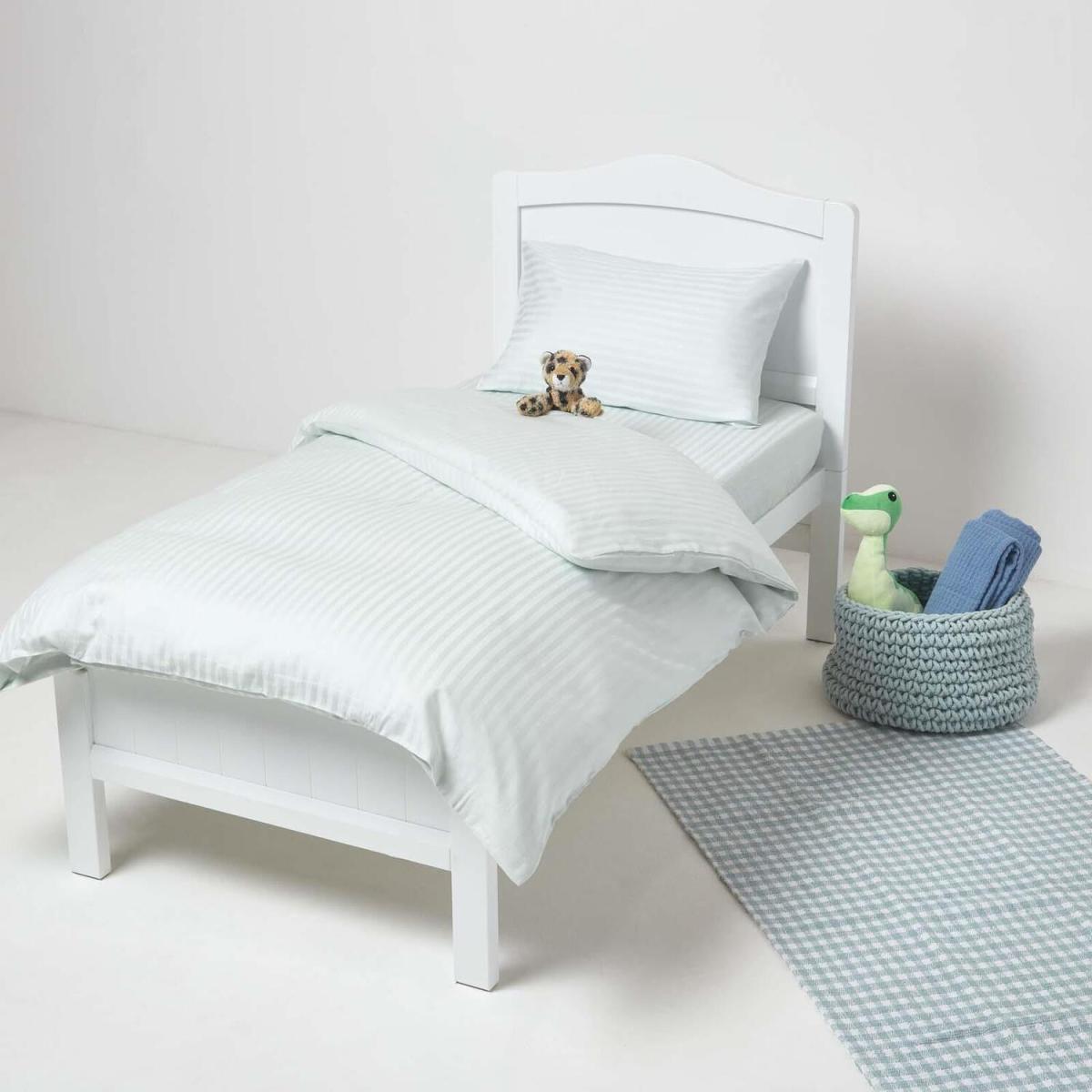 A British company, established in 2000, Homescapes are specialists in high-quality bed linen for all ages. We dont just buy our bedsheets, we build them. Beginning by hand-picking the purest cotton fibres to finely combing and spinning the yarn in the finest spinning facilities to our required specifications. We select the weaving machines to weave our fabrics and the processors to dye them always ensuring that your children bed linen serves your child for years and leaves a unique, fresh experience that only cotton can provide each time your child goes to bed. Super soft and durable, Homescapes childrens cotton bed linen is anti-dust mite and naturally hypoallergenic, making it the perfect choice for baby soft sensitive skin. This super soft exclusive range is created using single ply (40s) super combed yarn, woven in a plain percale weave. Naturally hypoallergenic and anti-dust mite Homescapes 100 cotton cot sheets and cot bedsheets are perfect for young children and toddlers, kind to sensitive skin the natural fibres wick away sweat, allowing them to stay comfortable throughout the night. In a single square inch, 200 yarns are woven, making it equivalent to 400 thread count twisted yarns. When compared with sheets made with twisted yarns (as most are), Homescapes durable single ply will last much longer and becomes even softer with every wash perfect for even the softest babys skin. Homescapes developed this affordable but high-quality range in 2008, one of our most popular ranges, now available in six colours. Fitted sheets are fully elasticated (not just in the corners) and are extra deep, ensuring the sheet remains in place as your child moves.
