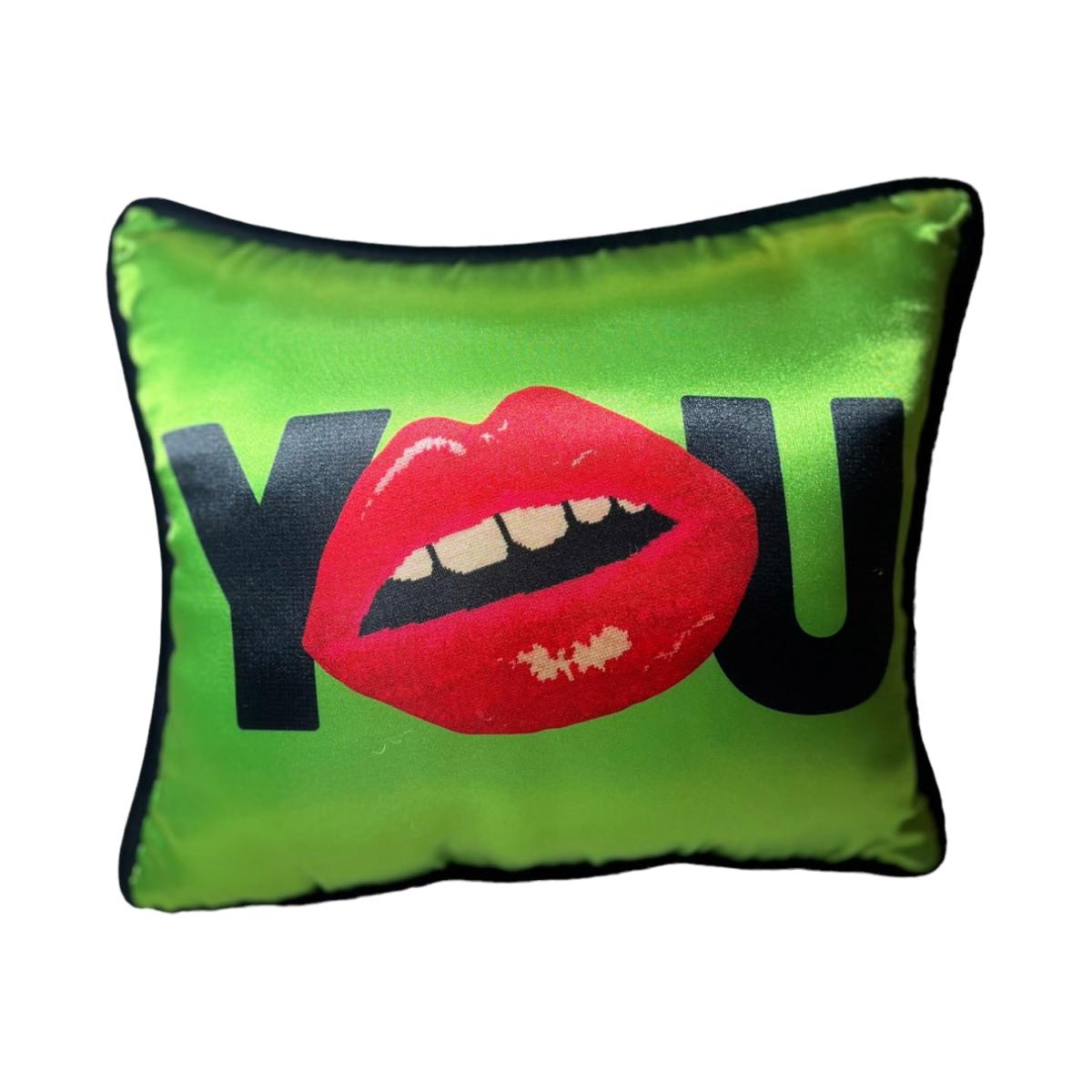 You, featured in brilliant, eye-popping satin and a luscious pouty kiss! custom made with crazy heart and soul delivered new to you to in eco-friendly packaging dry clean private label satin face, 100% polyester ink black designer velvet reverse and welting, 100% polyester poly fiber insert zipper digitally printed in the US using eco-friendly, water-based inks