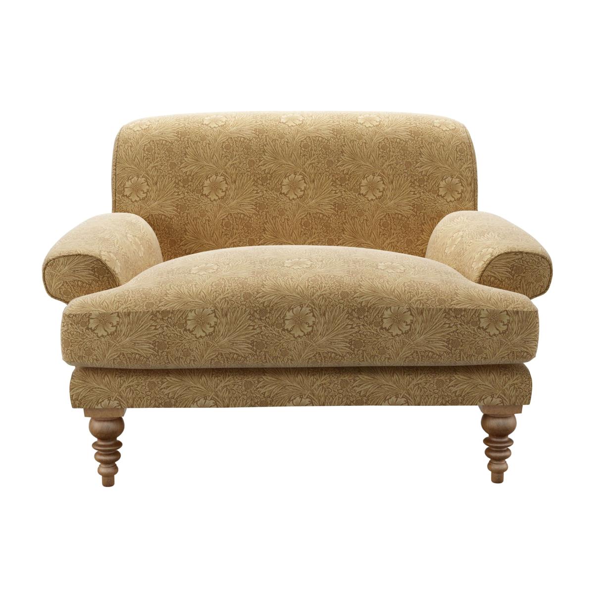 I love this little love seat for its vibrant Marigold Velvet Ochre finish-it adds a lively pop of colour that works well in both modern and vintage-inspired interiors. Its compact size makes it versatile for smaller living spaces or as an accent piece in larger rooms. Pair it with neutral or muted tones in cushions and throws to let the colour really stand out, or mix with richer jewel tones for a more opulent feel. The vintage-inspired design with turned legs and softly rounded arms lends itself well to eclectic or traditional interiors, but can also be styled to soften minimalism with plush textiles or patterned cushions. In terms of styling tips, consider adding a cosy throw or some textured cushions for comfort and visual interest, and keep surrounding furniture simple to let the colour be the focal point.