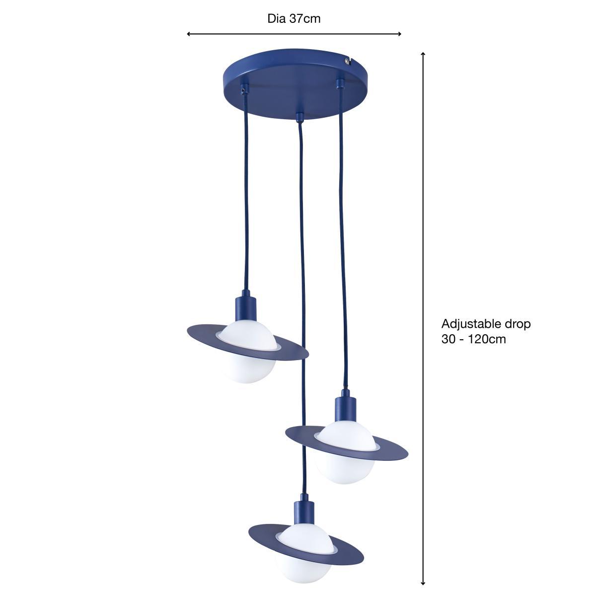 Introduce a fun touch to your kids bedroom with this modern contemporary Saturn 3 Light Cluster Ceiling Fitting. Beautifully designed with three height adjustable cluster light pendants in the shape of the planet Saturn, made from steel and glass. Pair this light fitting with matching family items to help coordinate your little ones bedroom. Suitable for use with LED lamps and dimmable compatible with a suitable light bulb and switch.