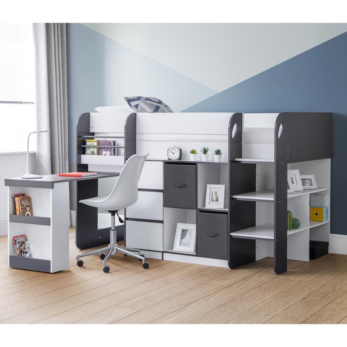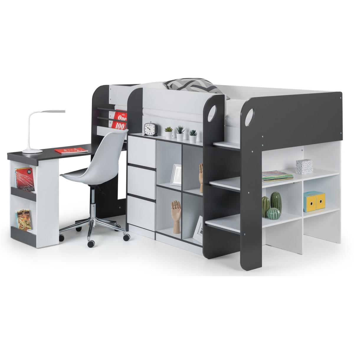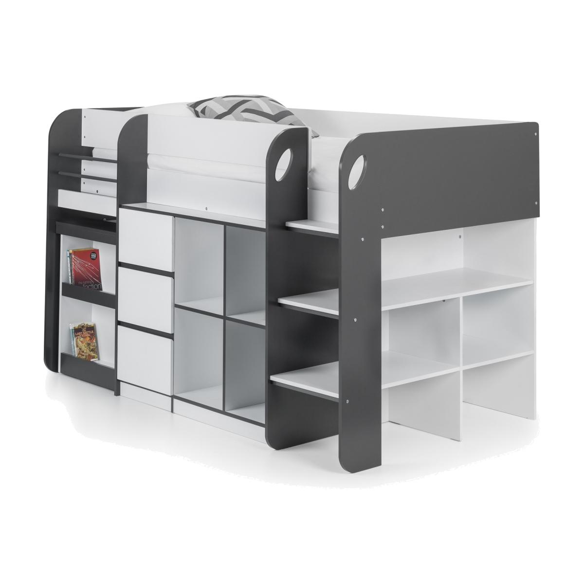 Offering a compact, space saving design, the Saturn Midsleeper features a bookcase, 3 drawer chest, and a cube bookcase saving floor space for toys and more. Finished in a modern charcoal grey and white, this midsleeper is perfect for a wide range of childrens bedroom dcor. Crafted from sturdy particleboard, this bed has a wooden slatted base and fits a UK single mattress.