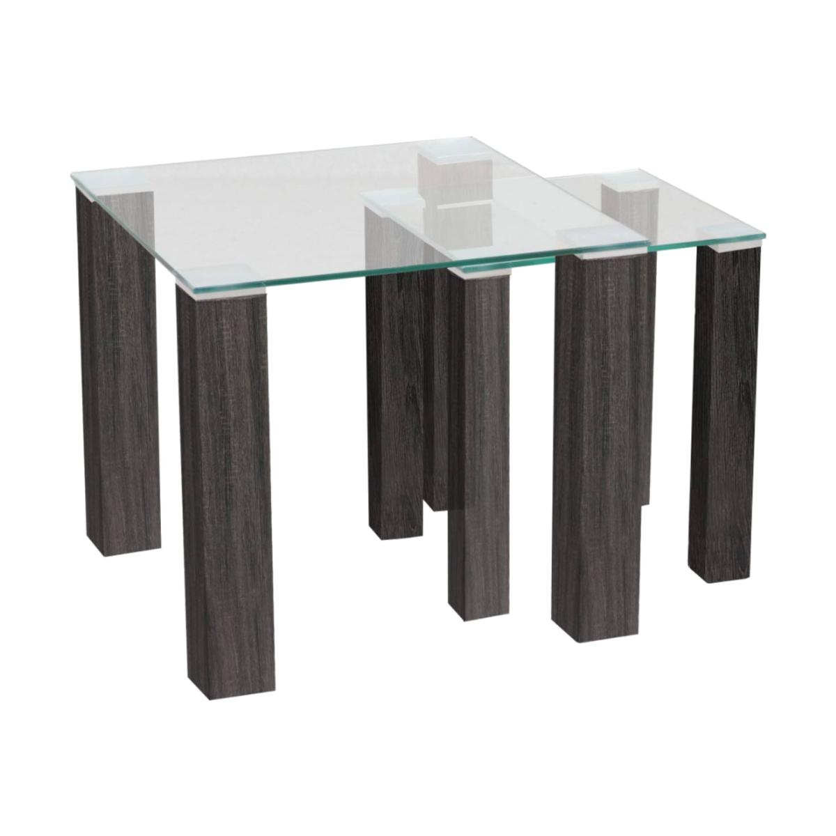 Contemporary set of tables boasting a glass table top and oak veneer legs. Large Table. Small Table. A beautiful addition to your home, this nest of tables is part of the Saturn range. This elegant set comes with 2 tables, each boasting a glass table top supported by oak veneer legs. Each leg is finished with square pieces of chrome detailing, of which is pressed against the table top. It is ideal for use in lounges, hallways and dining rooms.