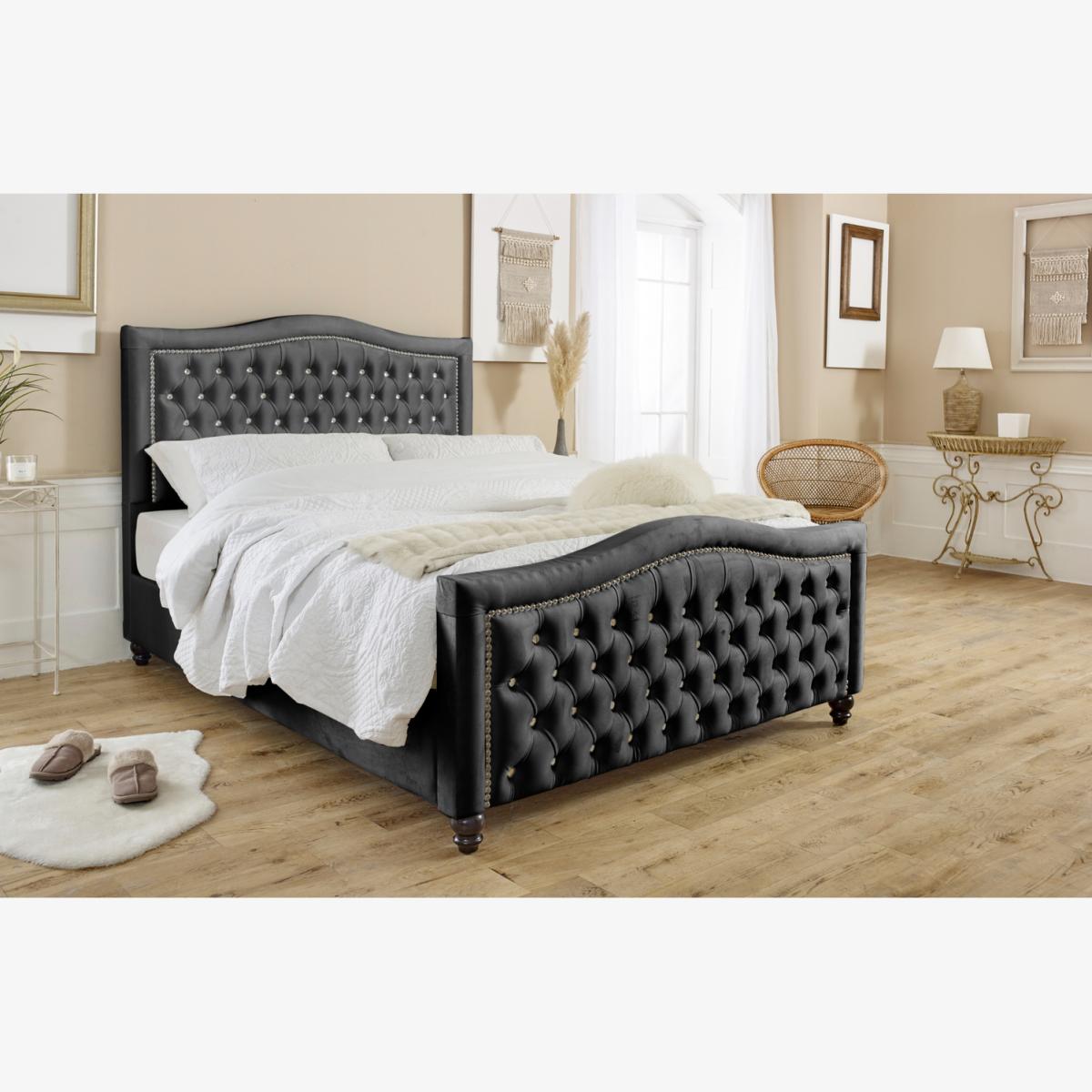 Our Saturn is a perfect blend of sleek modern design and lavish handcrafted panels that oozes the Victorian-era aesthetic and luxury. There is nothing not to love about this iconic bed design. The elegant headboard makes it a real design statement and with the plush velvet, you will always look forward to sleeping and waking up on this exquisite piece of pleasure. The Saturn features Spanish upholstery with a diamante headboard and footboard. The solid board frame and chrome feet make the bed a perfect choice for stability and strength. Our Saturn is every shade of sophistication and luxury in a single piece. You can choose from the variety of colors available.
