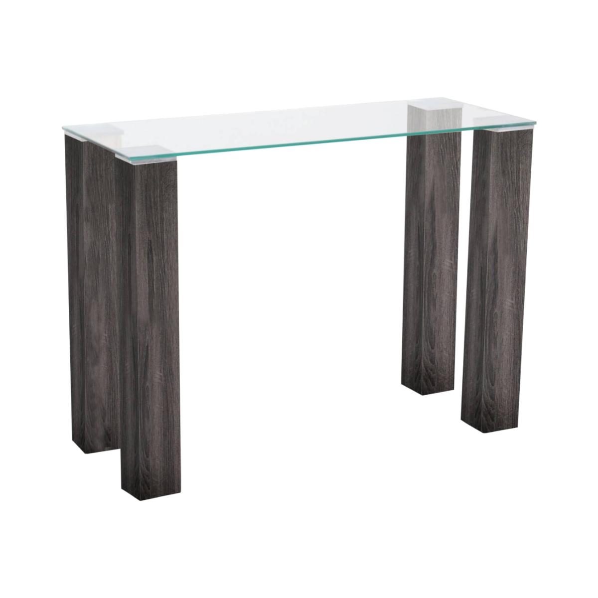 I love this table for its sleek, contemporary design that effortlessly blends versatility with style. The combination of solid wood legs with a glass top makes it a perfect addition to modern or minimalist interiors, but it can also complement industrial or transitional spaces. Practical styling tips include using it as a landing spot for decorative pieces like vases or books, but it works equally well as a subtle side table for lamps or drinks. Its neutral grey finish makes it easy to coordinate with colour schemes, and its clean lines keep the look feeling fresh and uncluttered. Placing it near a sofa or armchair provides both function and visual interest without overpowering the room.