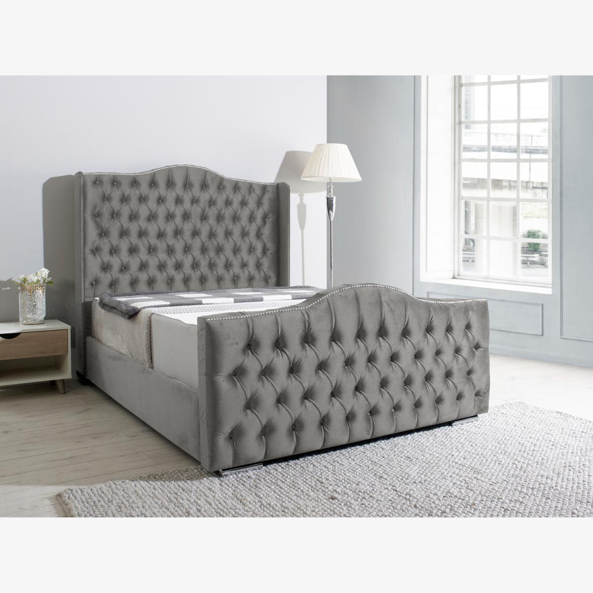 Transform your bedroom and turn it into a sophisticated space with the Saturn Wing bed. Made of solid wood and upholstered in a stunning velvet fabric, the Saturn Wing bed frame is a true definition of style and elegance. It features a large wing headboard and footboard with exquisite button tufts detailing and antique brass trimming for the nailhead. The Saturn Wing bed comes with a solid board base, chrome feet, and a 4-inch solid thick frame for excellent support. Adding this piece of furniture to your bedroom will undoubtedly transform your space. The mattress and other accessories in the image shown for this product are not included in the package. However, you can order them at additional cost and they will be delivered with your Saturn Wing bed frame.