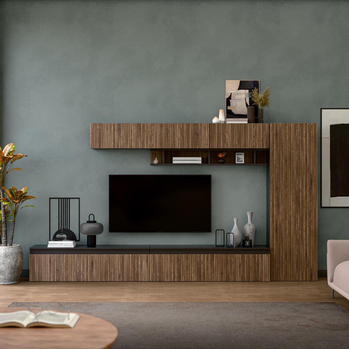 Transform your living room with this modern wall unit that combines clean lines with clever storage. Designed to frame your television in style, this unit features a sleek modular layout with a balanced mix of open shelves and closed compartmentsperfect for showcasing books, plants, photos, and decorative pieces while keeping essentials neatly tucked away. Its tall, vertically structured side panels offer a visually dynamic element, while the horizontal upper shelving adds symmetry and function. With dedicated space for your flat-screen TV and generous lower cabinets, this entertainment unit blends form and function to meet the needs of everyday living. Key Features Modular design for customisable installation Open and closed storage for display and organisation. Built-in TV niche fits most standard flat-screen models. Vertical shelving ideal for decorative accents and books. Sleek, easy-clean finish for everyday convenience Ideal for modern and minimalist interiors, this wall unit delivers a clean, contemporary look while maximizing living room space.