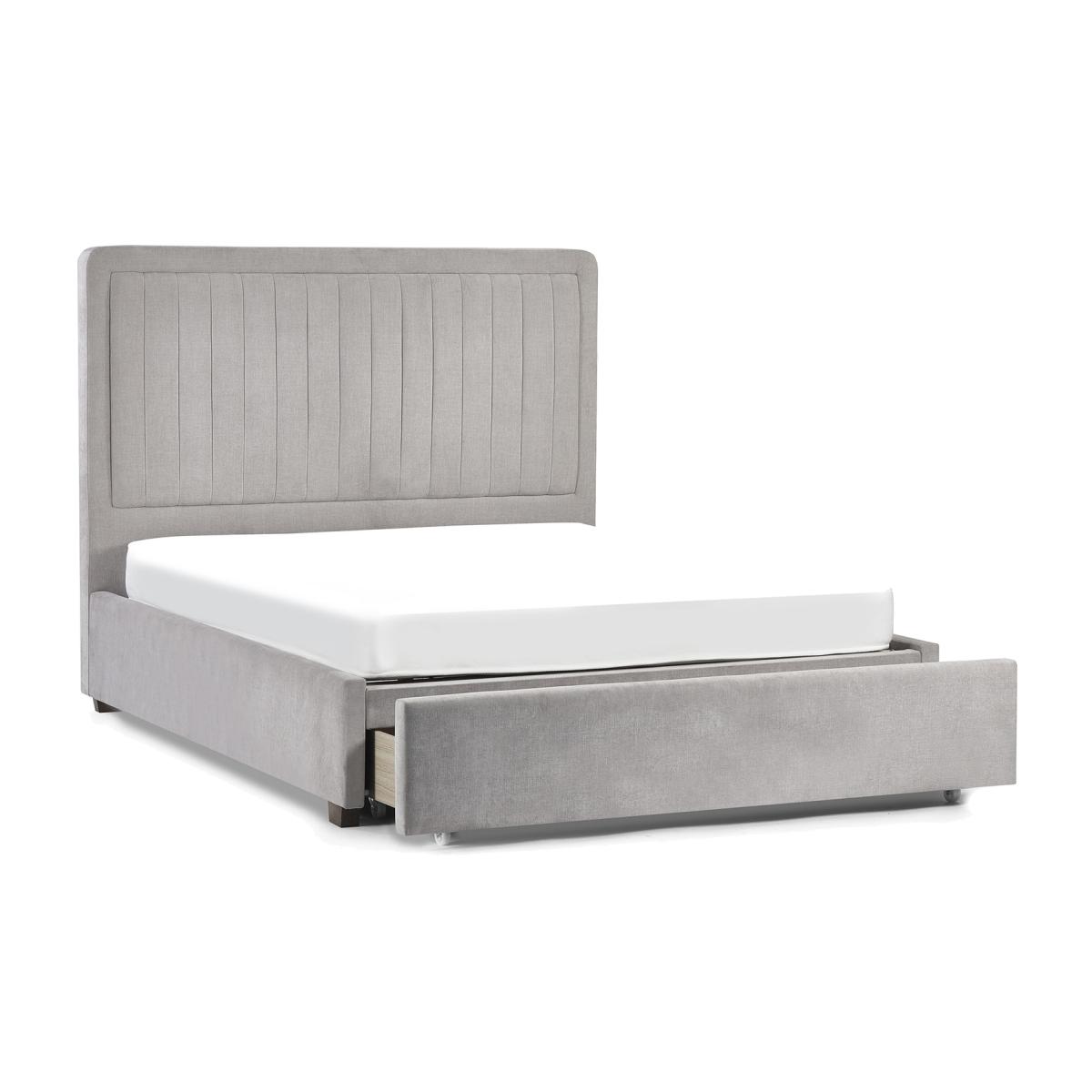 The Savannah grey velvet bed exudes sophistication and creates a soft, inviting ambiance in your sleep sanctuary. The fluted headboard design adds a touch of elegance, turning your bed into a focal point that captures attention with its refined details. Immerse yourself in the indulgent softness of the velvet upholstery, making bedtime a truly luxurious experience. Designed with practicality in mind, this bed features a large storage drawer at the front, providing a discreet and convenient solution to declutter your space. Whether you need extra space for bedding, pillows, or other bedroom essentials, this storage drawer effortlessly combines style with functionality, ensuring your room stays organized and stylish.