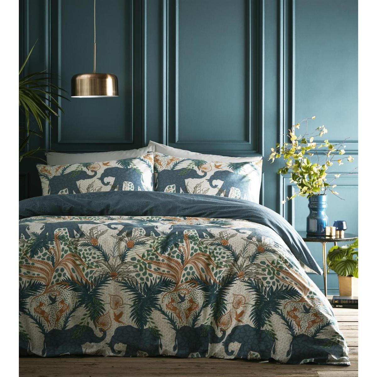 Elephants and palm trees are combines with a tropical jungle pattern to create a duvet which explores ethnic routes and travel. Shades of teal and plum are complemented on a beige background to give a contemporary feel. Perfect for adding tropical charm to your room.