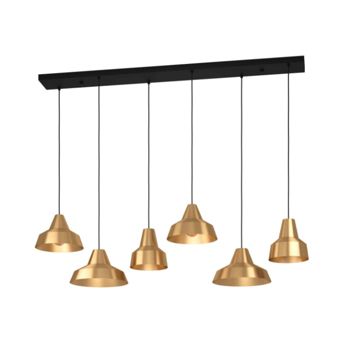 Contemporary 6 light ceiling pendant featuring gold metal shades The Savarna is a funky ceiling pendant featuring six individual shaped gold shades and matt black finish. Ideal for hanging over breakfast bars, kitchen islands and dining areas. Contemporary 6 light ceiling pendant featuring gold metal shades The Savarna is a funky ceiling pendant featuring six individual shaped gold shades and matt black finish. Ideal for hanging over breakfast bars, kitchen islands and dining areas.