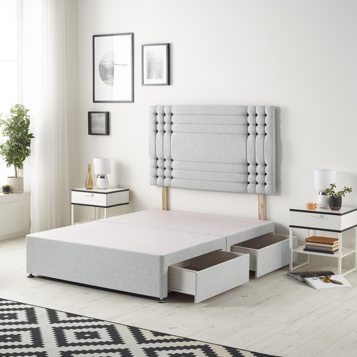 The Saville Linen Fabric Divan Bed Base with 32 Upholstered Headboard combines timeless luxury with everyday durability. Its solid platform top base provides a firm, stable foundation for your mattress, delivering superior support compared to slatted frames. Expertly crafted in the UK from quality timber and finished in linen fabric, it brings refined elegance to any bedroom. The 32 upholstered headboard features tufted panels with black diamante buttons and structured panels, creating a focal point while offering comfort when sitting up in bed. Taller than standard 24 designs, it makes a grand statement. The base measures 34.5cm in height with gliders attached (30.5cm without) and is available in all standard. Headboard face panel is 32"86cm, height adjustable by struts. This option 4 draw storage bed base comes with easy access bed drawers, 2 on each side.