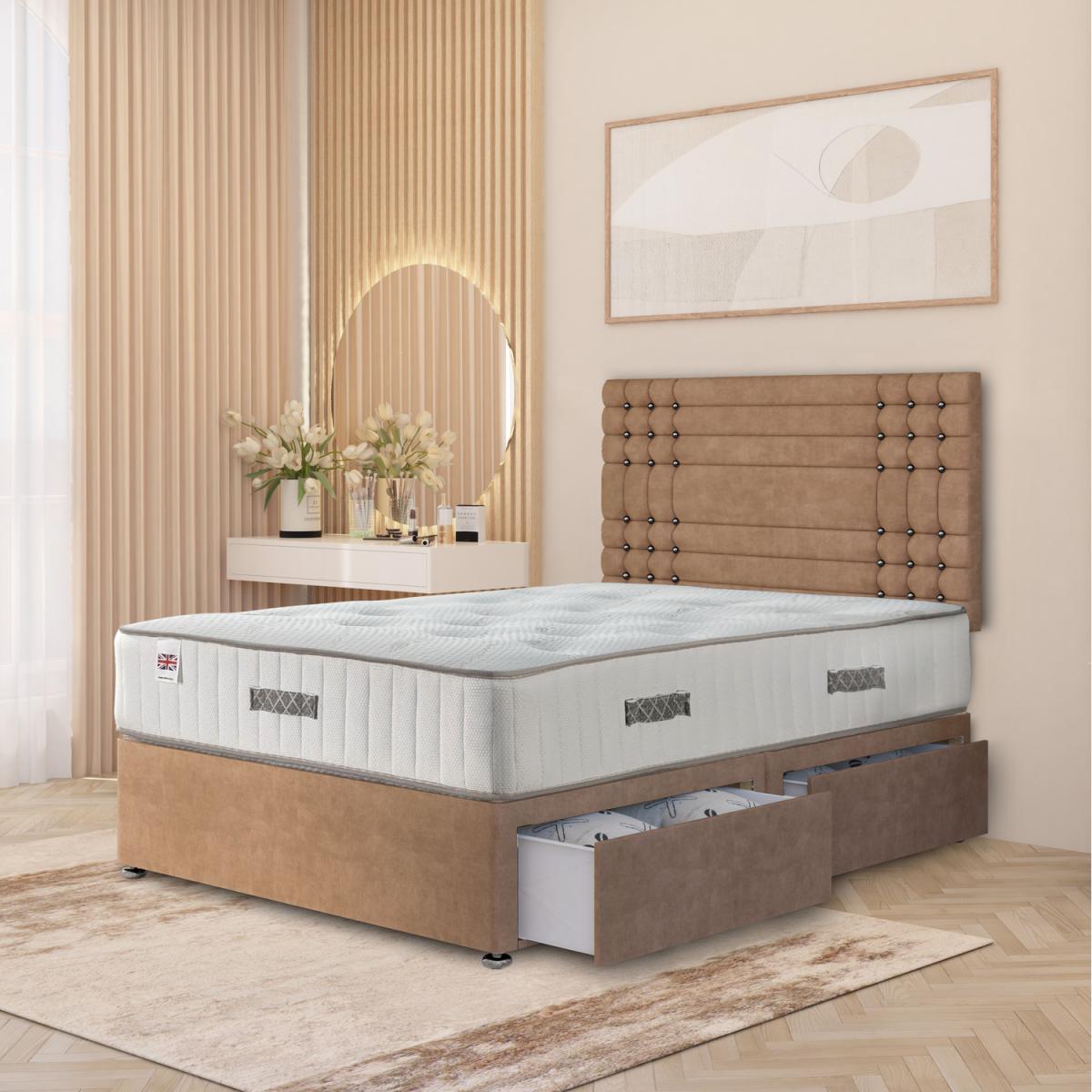 The Saville Plush Velvet Divan Bed Set with Upholstered Headboard combines timeless design with superior comfort. Its solid platform top divan base ensures long-lasting durability and stable mattress support. Upholstered in sumptuous plush velvet, the set includes a tall 32 vertical panel headboard with tufted black diamante buttons, for an elegant, refined finish. The 28cm Hybrid Midnight Orthopaedic Mattress combines 1000 pocket springs with layers of luxury foams and an eco pad, providing pressure relief, balanced support, and temperature regulation. Expertly handcrafted in the UK and available in all standard sizes. This option storage bed comes with 4 easy access storage drawers, 2 on each side.