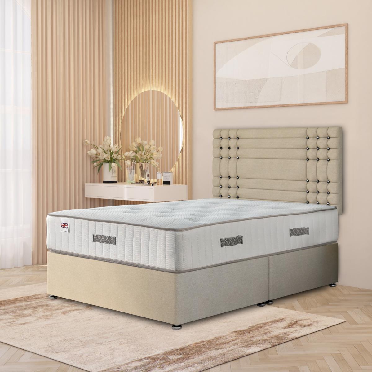 The Flexby Tweed Fabric Divan Bed Set with Upholstered Headboard combines timeless design with superior comfort. Its solid platform top divan base ensures long-lasting durability and stable mattress support. Upholstered in sumptuous Tweed Fabric, the set includes a tall 32 vertical panel headboard for an elegant, refined finish. The 28cm Hybrid Midnight Orthopaedic Mattress combines 1000 pocket springs with layers of luxury foams and an eco pad, providing pressure relief, balanced support, and temperature regulation. Expertly handcrafted in the UK and available in all standard sizes. Proudly manufactured in the UK. Available in all standard UK Bed sizes.