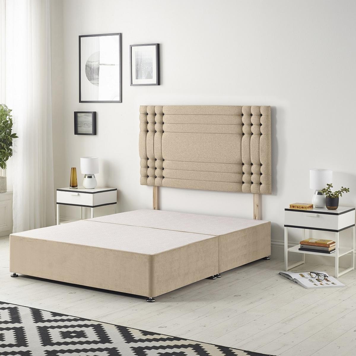 The Saville Plush Velvet Divan Bed Base with 32 Upholstered Headboard combines timeless luxury with everyday durability. Its solid platform top base provides a firm, stable foundation for your mattress, delivering superior support compared to slatted frames. Expertly crafted in the UK from quality timber and finished in plush velvet fabric, it brings refined elegance to any bedroom. The 32 upholstered headboard features tufted panels with black diamante buttons and structured panels, creating a glamorous focal point while offering comfort when sitting up in bed. Taller than standard 24 designs, it makes a grand statement. The base measures 34.5cm in height with gliders attached (30.5cm without) and is available in all standard. Headboard face panel is 32"86cm, height adjustable by struts.