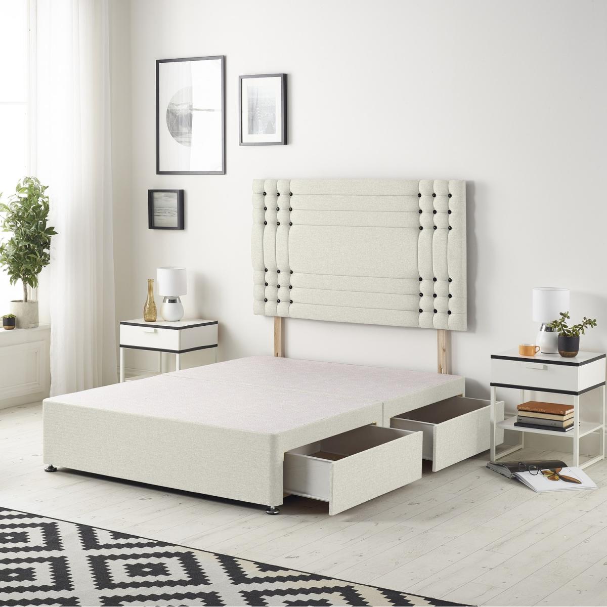 The Saville Plush Velvet Divan Bed Base with 32 Upholstered Headboard combines timeless luxury with everyday durability. Its solid platform top base provides a firm, stable foundation for your mattress, delivering superior support compared to slatted frames. Expertly crafted in the UK from quality timber and finished in plush velvet fabric, it brings refined elegance to any bedroom. The 32 upholstered headboard features tufted panels with black diamante buttons and structured panels, creating a glamorous focal point while offering comfort when sitting up in bed. Taller than standard 24 designs, it makes a grand statement. The base measures 34.5cm in height with gliders attached (30.5cm without) and is available in all standard. Headboard face panel is 32"86cm, height adjustable by struts. An excellent space saving storage bed. Drawers can be placed left or right side as the headboard fits either end of the base.