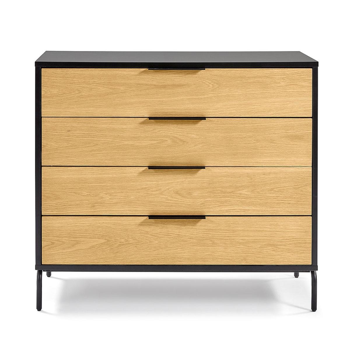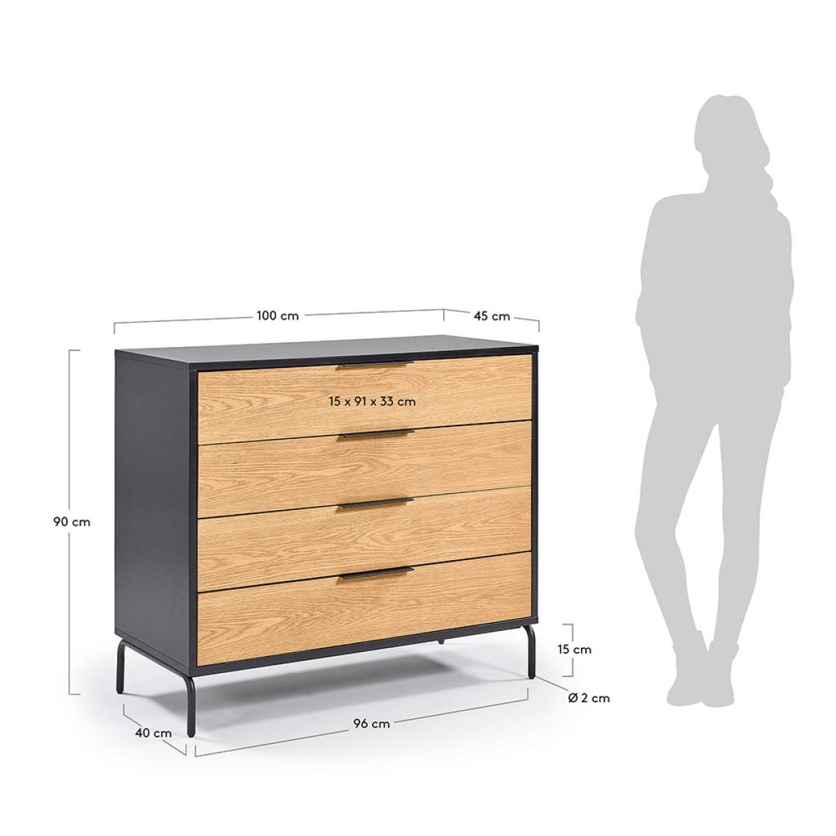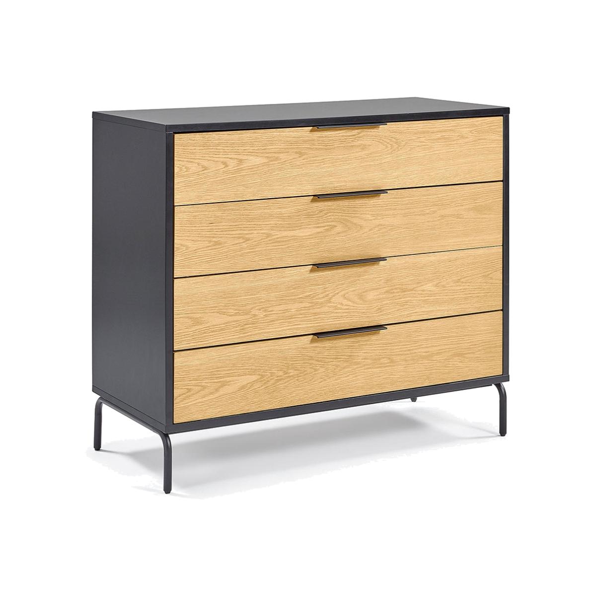 Contemporary with industrial elements; the. Savoi Chest of Drawers in Oak Veneer will completely revamp your bedroom! Including 4 full length drawers, there's plenty of space to keep clothes neat and tidy. There's even enough room to display family photographs, decorations and house plants on the smooth top. Finished in matte black with Oak veneer fronts, the bold design is sure to standout in your chosen space. And with matching Bedside Tables available from La Forma, you'll wake up happy every morning with these beauties next to you!.