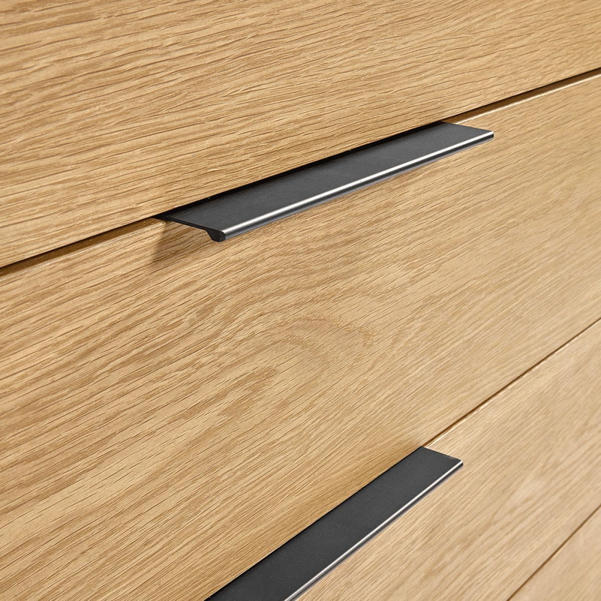 I love this chest of drawers because of its clean, minimalist design and the lovely contrast between the warm oak veneer and the sleek black frame. It works particularly well in contemporary or Scandi interiors, adding a touch of natural texture without feeling bulky. Practical tips include styling it with a few carefully selected accessories on top, like a vase or a tray, to keep the surface tidy and inviting. It's versatile enough to sit in bedrooms, living rooms, or even hallways, making it a functional statement piece that brings a modern aesthetic while offering ample storage.