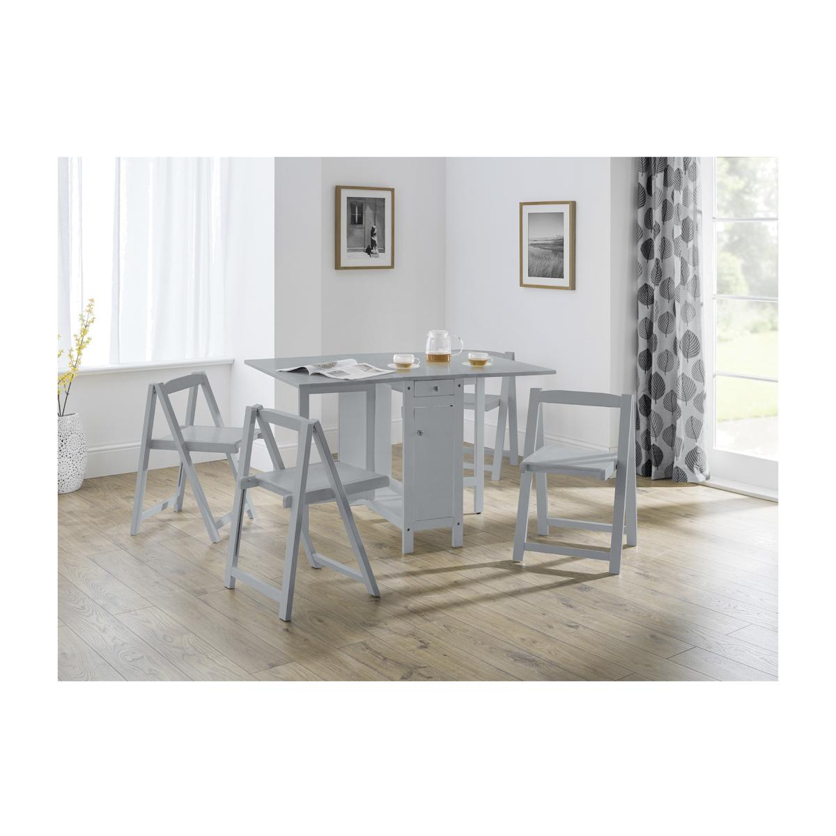 A neat and functional, space-saving dining set where the chairs can be folded and stored Inside the table. This dining set is a timeless classic that features an integrated storage drawer, perfect for small spaces with less storage.