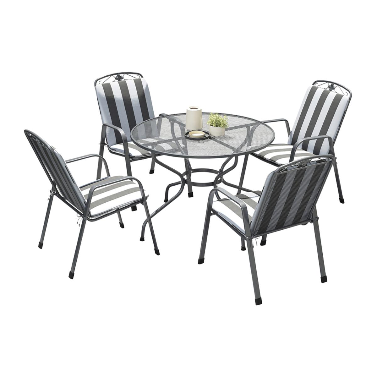 I love this set for its modern yet versatile aesthetic-perfect for creating a contemporary outdoor or indoor dining space. The round metal mesh table with its sleek silver finish works well in both minimalist and more industrial interiors, while the four cushioned chairs add comfort and a touch of casual elegance. It's practical too, as the mesh design ensures easy maintenance and good durability. For styling tips, consider pairing it with neutral-toned tableware and a simple centrepiece, like a potted plant or candles, to keep the look fresh and inviting. It also works well with striped or solid-coloured cushions to add a pop of colour or pattern, helping it blend seamlessly into both relaxed patio areas and modern dining rooms.