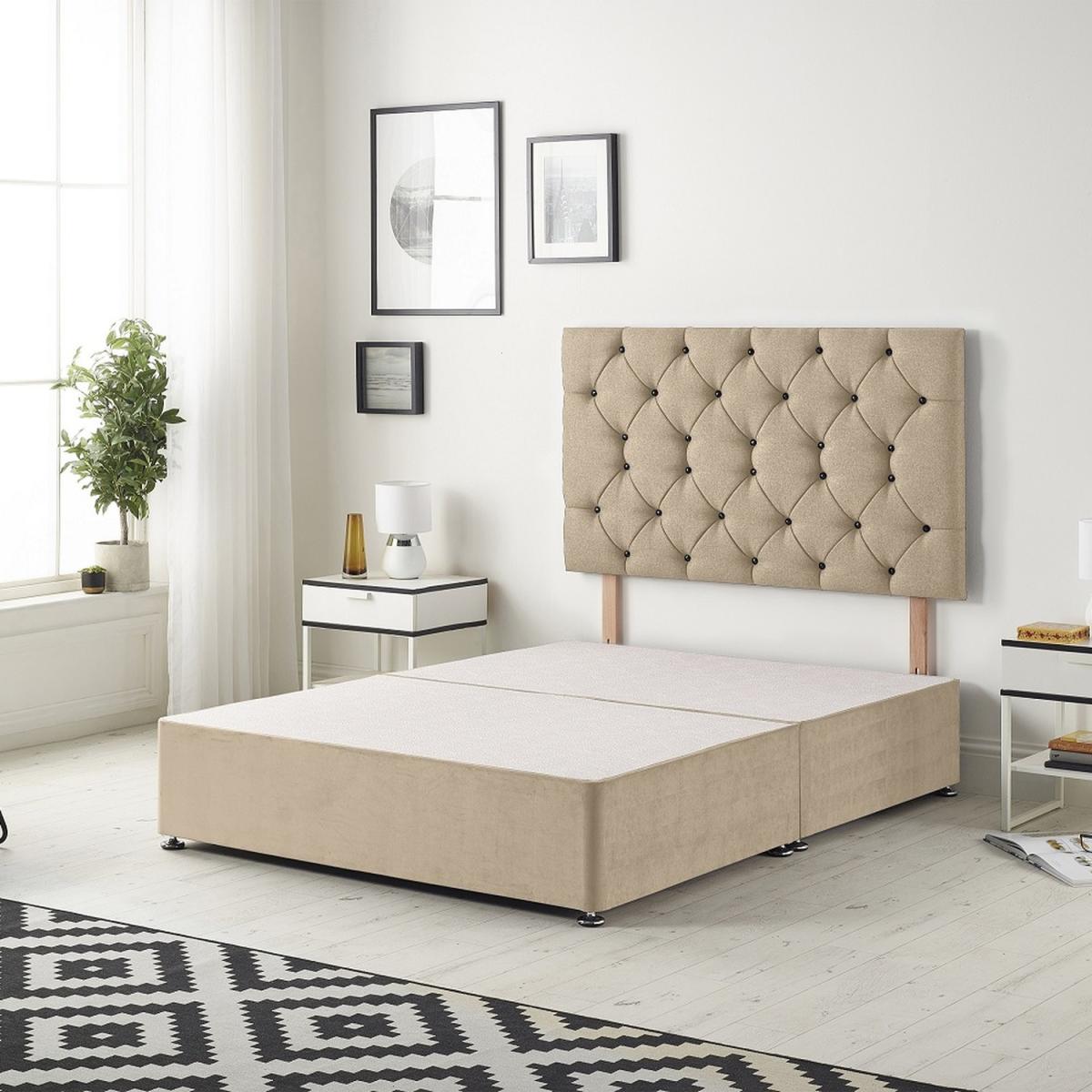 The Savoy Tweed Fabric Divan Bed Base with 32" Upholstered Headboard combines timeless luxury with everyday durability. Its solid platform top base provides a firm, stable foundation for your mattress, delivering superior support compared to slatted frames. Expertly crafted in the UK from quality timber and finished in tweed fabric to give a textured appearance, it brings refined elegance to any bedroom. The 32 upholstered headboard features tufted panels with black diamante buttons, creating a glamorous focal point while offering comfort when sitting up in bed. Taller than standard 24" designs, it makes a grand statement. The base measures 34.5cm in height with gliders attached (30.5cm without) and is available in all UK sizes 2FT. 6 Small Single, 3FT Single, 4FT Small Double, 4FT. 6 Double, 5FT King, and 6FT Super King. Choose from practical storage options including No Drawers, 2 Drawers (same side), or 4 Drawers, for a bed that is both stylish and functional. Headboard face panel is 32"86cm, height adjustable by struts.