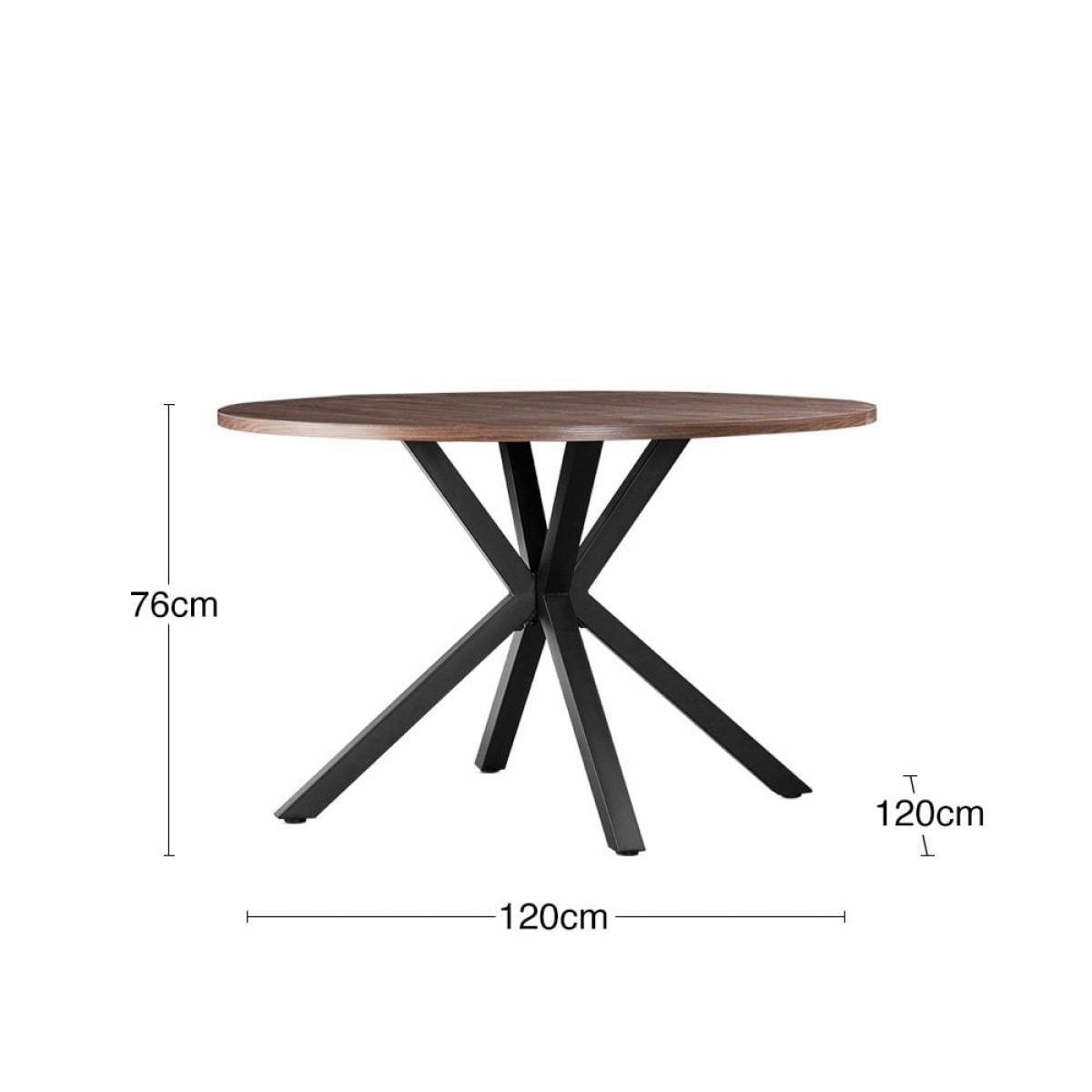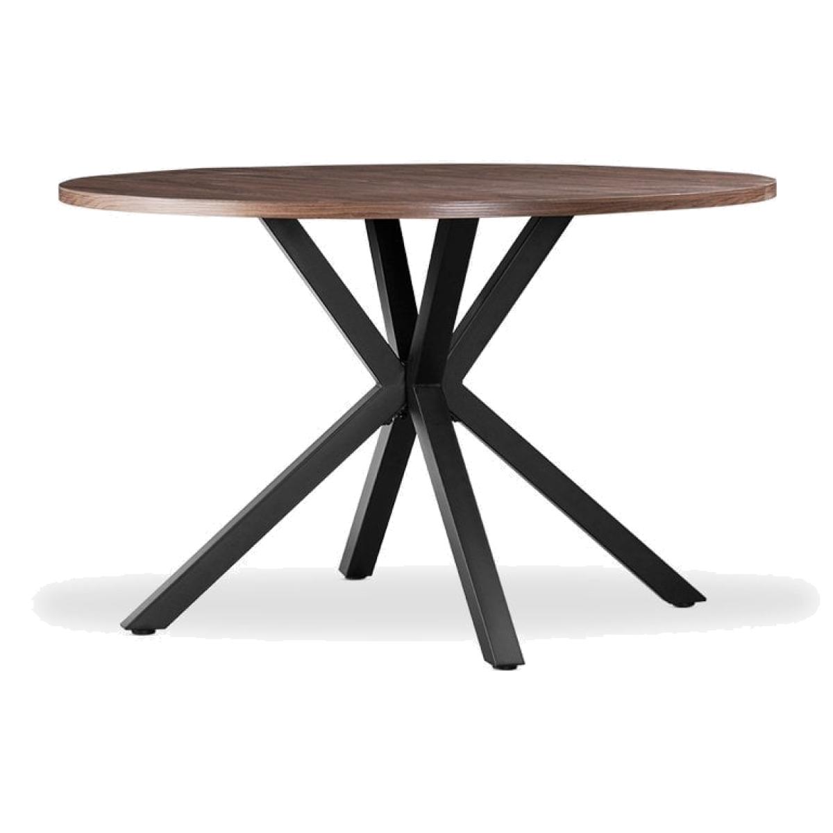 Comfortably sitting 4 people, the blend of raw materials mixes contemporary industrial design with everyday dining for a modern dining table built to last. The Sawyer Round Dining Table in Walnut Finish features sculptural starburst metal legs in black that offer stability and maximise legroom whilst the durable surface is made from smooth paper foil; low maintenance in a contemporary modern design.